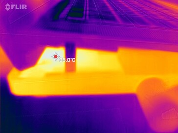AAS-Ultra-systemet, som höjer tangentbordet synligt, är främst avsett att hålla den bärbara datorn sval. Det är precis vad det gör. Genom att hålla tangentbordet en bit ifrån den bärbara datorns värmekällor förblir det klart svalt. Faktum är att de varmaste platserna på den bärbara datorns ovansida ligger runt 30 °C, även efter en timmes stresstester. Den bärbara datorn håller sig mestadels under 40 °C på undersidan också. Temperaturen i springan mellan tangentbordet och basen är betydligt varmare, men stiger inte alltför mycket över 40 °C. Ångkammaren, AAS-Ultra-kylningen och den bärbara datorns inställda prestandagräns garanterar ett svalt system.