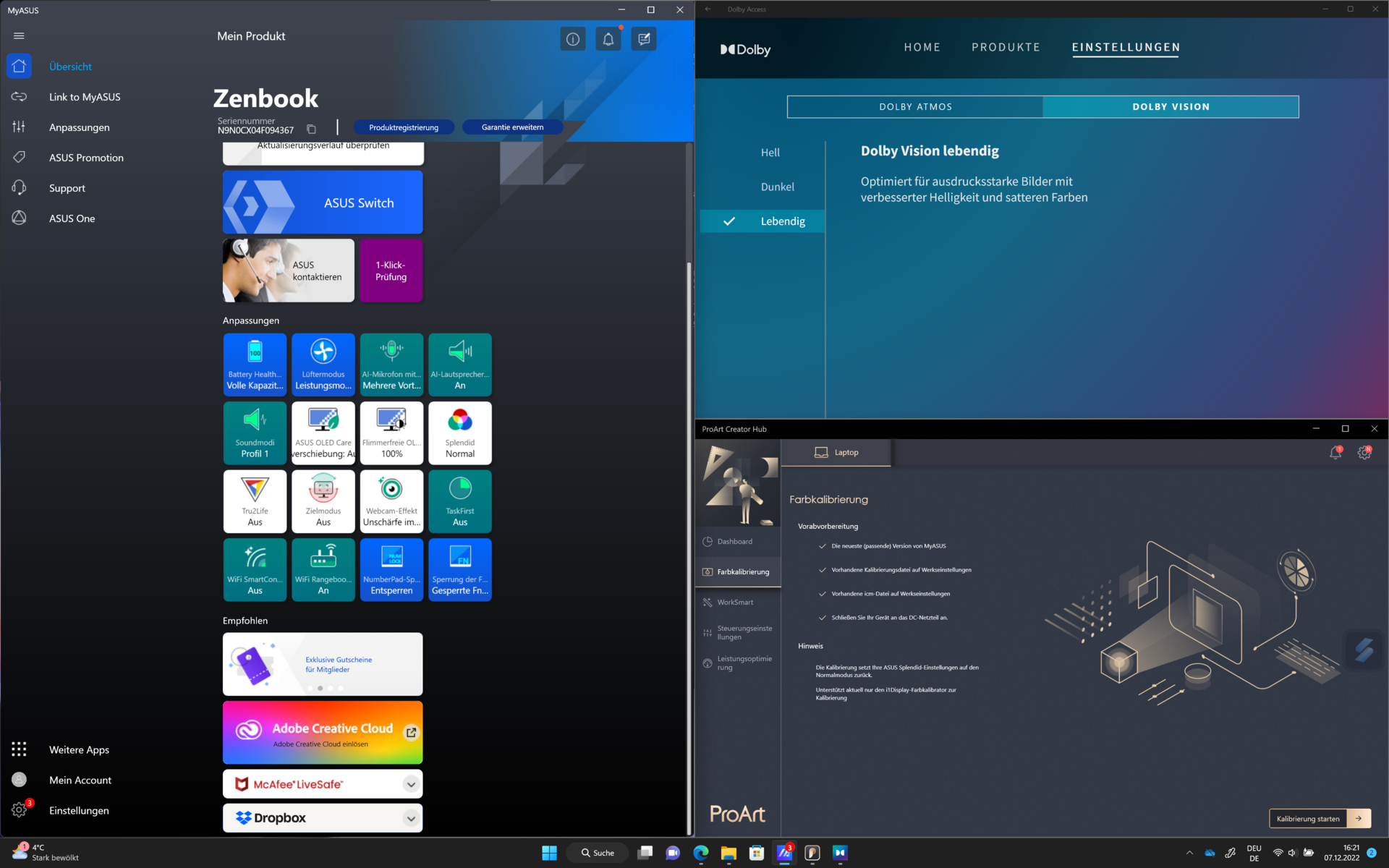 OLED-skärmen i Zenbook Pro 16X har en upplösning på 3840 × 2400. UHD-skärmen i 16:10-format ger starka kontraster och imponerande färger. Skärmblödning eller ojämn belysning förekommer vanligtvis inte i OLED-skärmar. Skärminställningarna justeras via MyAsus-appen och ProArt Creator Hub. Den bärbara datorn har två ljussensorer som anpassar bilden och skärmens ljusstyrka till det omgivande ljuset. Vi fastställde en maximal ljusstyrka på 360 cd/m² här. Färgtemperaturen och ljusstyrkan justeras automatiskt för att bibehålla en perfekt bildkvalitet. Skärmen stöder dessutom flera HDR-standarder och Dolby Vision. Med så många inställningsalternativ kan det vara lätt att tappa bort överblicken. Färgrumsrepresentation, färgtemperatur, ljusstyrka, HDR, sensorbeteende och många andra faktorer kan anpassas här. Tyvärr är de olika alternativen spridda över tre olika program. En kritik mot skärmen är de märkbara hålen i subpixelmatrisen. Vid full ljusstyrka kan man ibland se små grå prickar på skärmen.