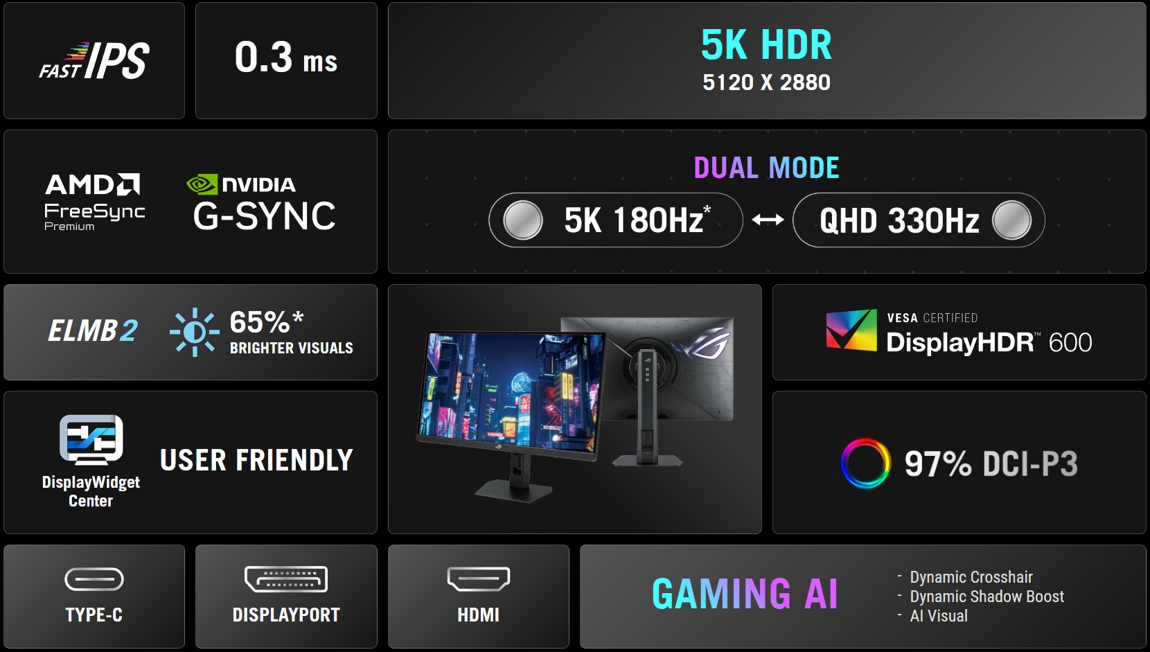 Med en GTG-klassad svarstid på 0,3 ms syftar ROG Strix XG27JCG också till att leverera en responsiv spelupplevelse i både QHD och 5K-lägen. Det finns stöd för AMD FreeSync Premium och Nvidia G-Sync, som tillsammans med ELMB Sync-teknik utlovar tårfria bilder.
