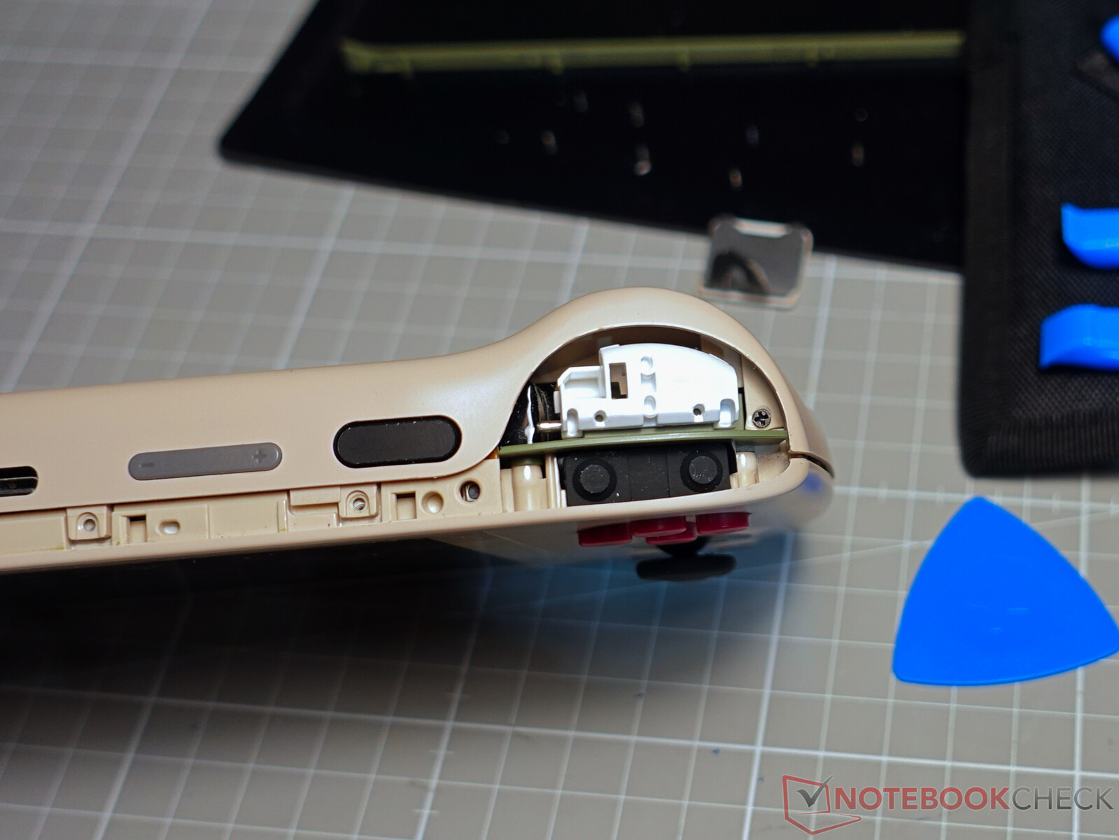 De två första skruvarna som håller ihop enheten kan enkelt hittas på var sin sida om USB-C-porten på undersidan. En annan är gömd under locket till microSD-kortplatsen. Några skruvar håller också fast de två halvorna av höljet på ovansidan. För att komma åt dem måste du försiktigt ta bort det övre staget mellan axelknapparna. Det finns också en skruv gömd under var och en av triggerknapparna. Efter skruvningen är det bara ett öppningsverktyg av plast som hjälper till att lyfta ut de många klämmorna. Sammantaget är fodralet mycket svårt att öppna.