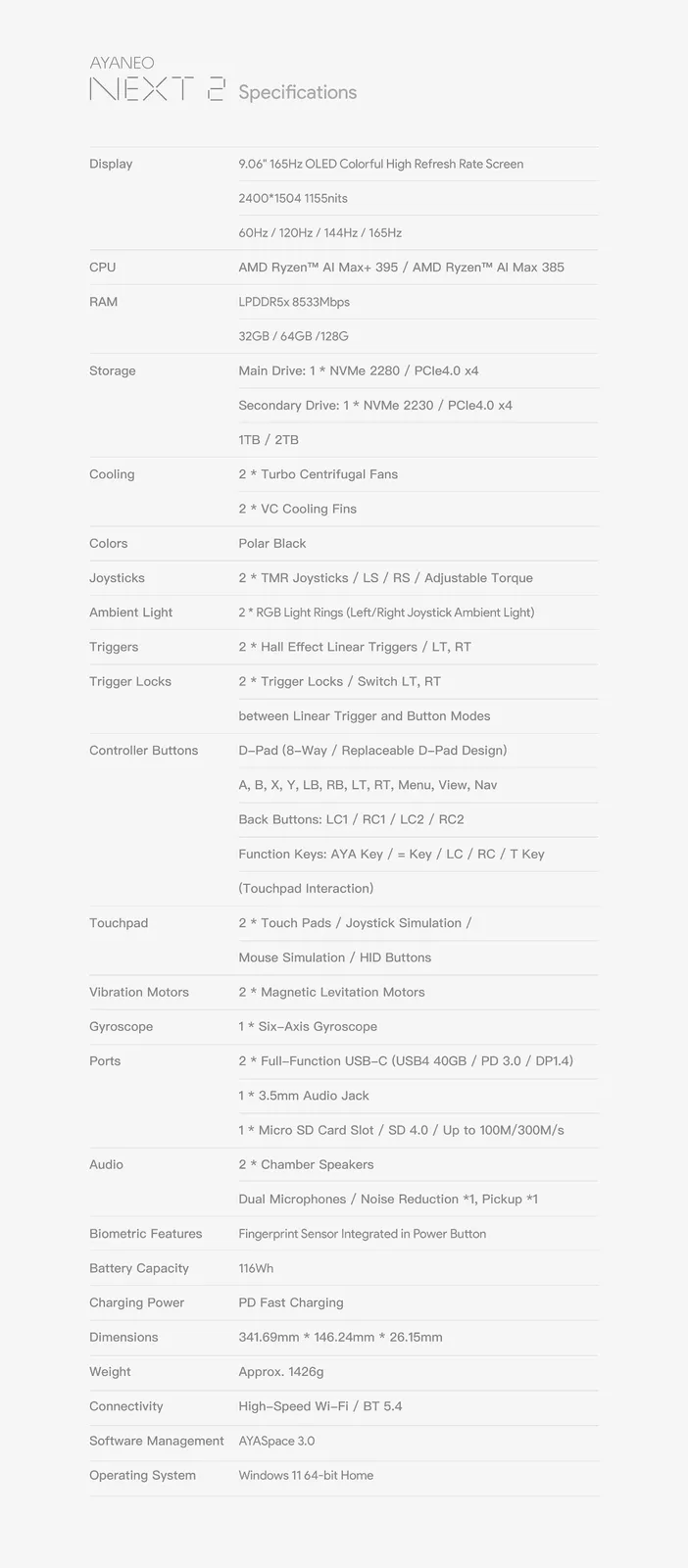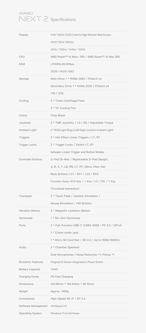 Specifikt erbjuder Ayaneo Next 2 med antingen Ryzen AI Max 385 eller Ryzen AI Max + 395, precis som OneXPlayer Apex och GPD Win 5 före det (curr. $ 2 399,99 på Amazon). Next 2 avviker från sina kamrater med en 9,06-tums OLED-skärm och ett 116 Wh externt batteri. Allt som allt väger Next 2 341,69 x 146,24 x 26,15 mm och väger cirka 1,43 kg. Vänligen se specifikationsbladet nedan för fullständiga tekniska detaljer.