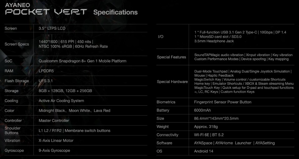 Som tidigare rapporterats kommer Pocket Vert att ha en 3,5-tums LTPS LCD-panel med en upplösning på 1440 x 1600 (615 PPI), en uppdateringsfrekvens på 60 Hz och en ljusstyrka på 450 nits. Nu har Ayaneo avslöjat att Pocket Vert kommer att drivas av Snapdragon 8+ Gen 1 mobilplattform. Processorn släpptes i maj 2022 och drev telefoner som t.ex Samsung Galaxy Z Fold 4 och OnePlus 10T.