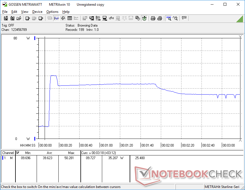 Vi kan registrera ett tillfälligt maximalt uttag på 50 W från den lilla (~9,5 x 4,1 x 6 cm) 47,5 W AC-adaptern när vi kör Prime95 och FurMark samtidigt.
