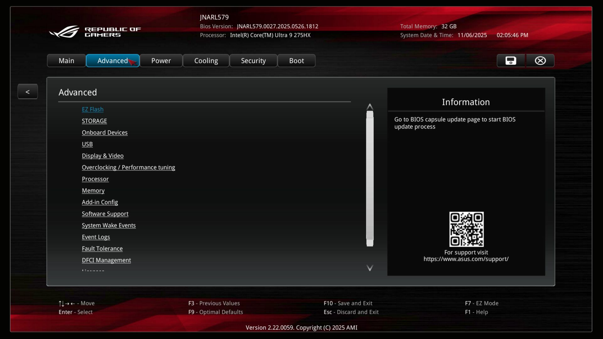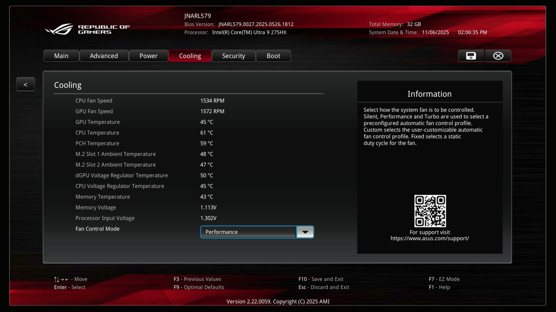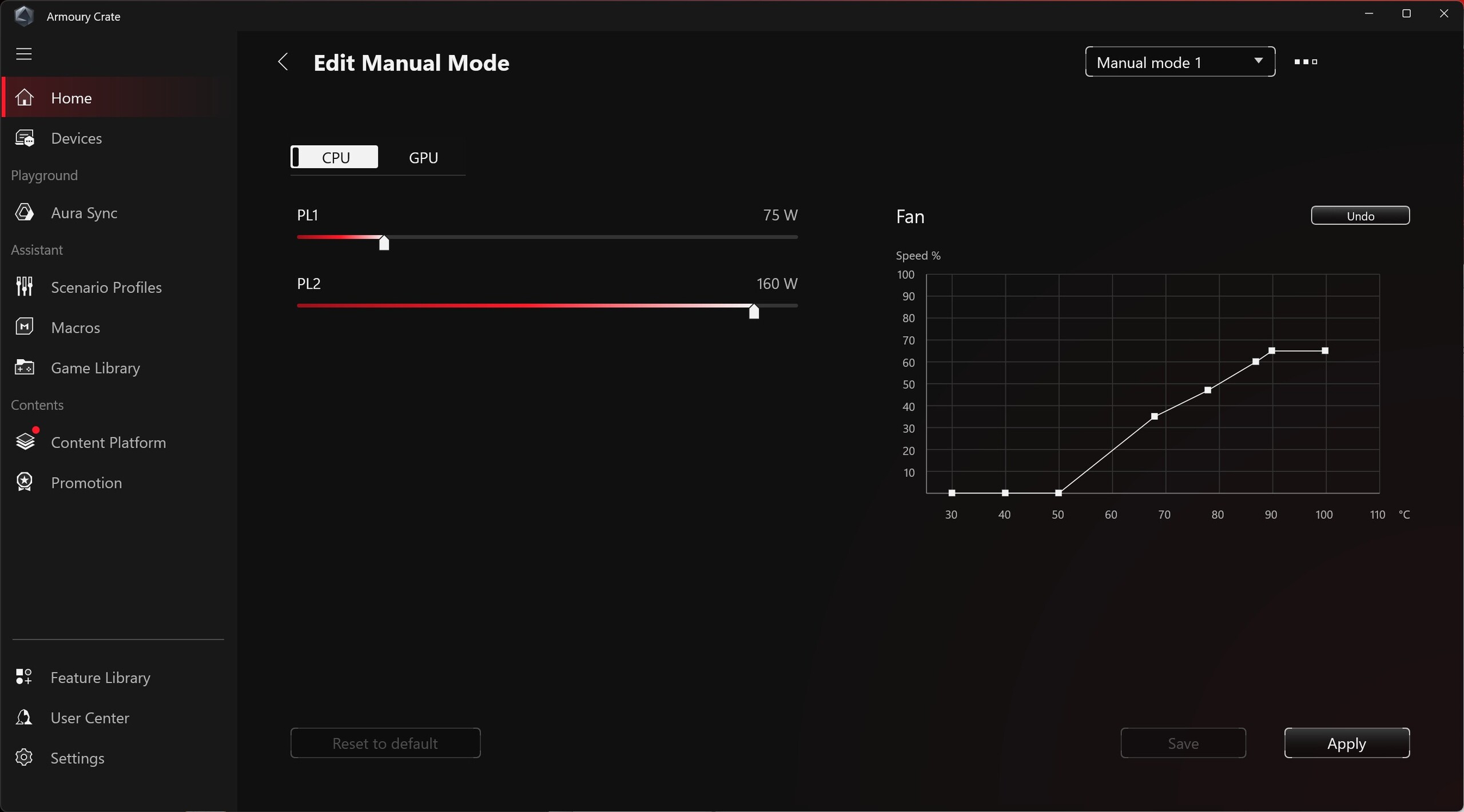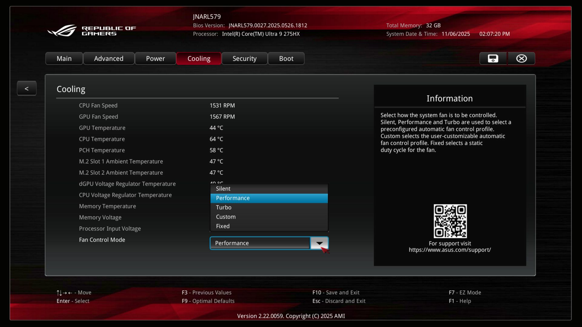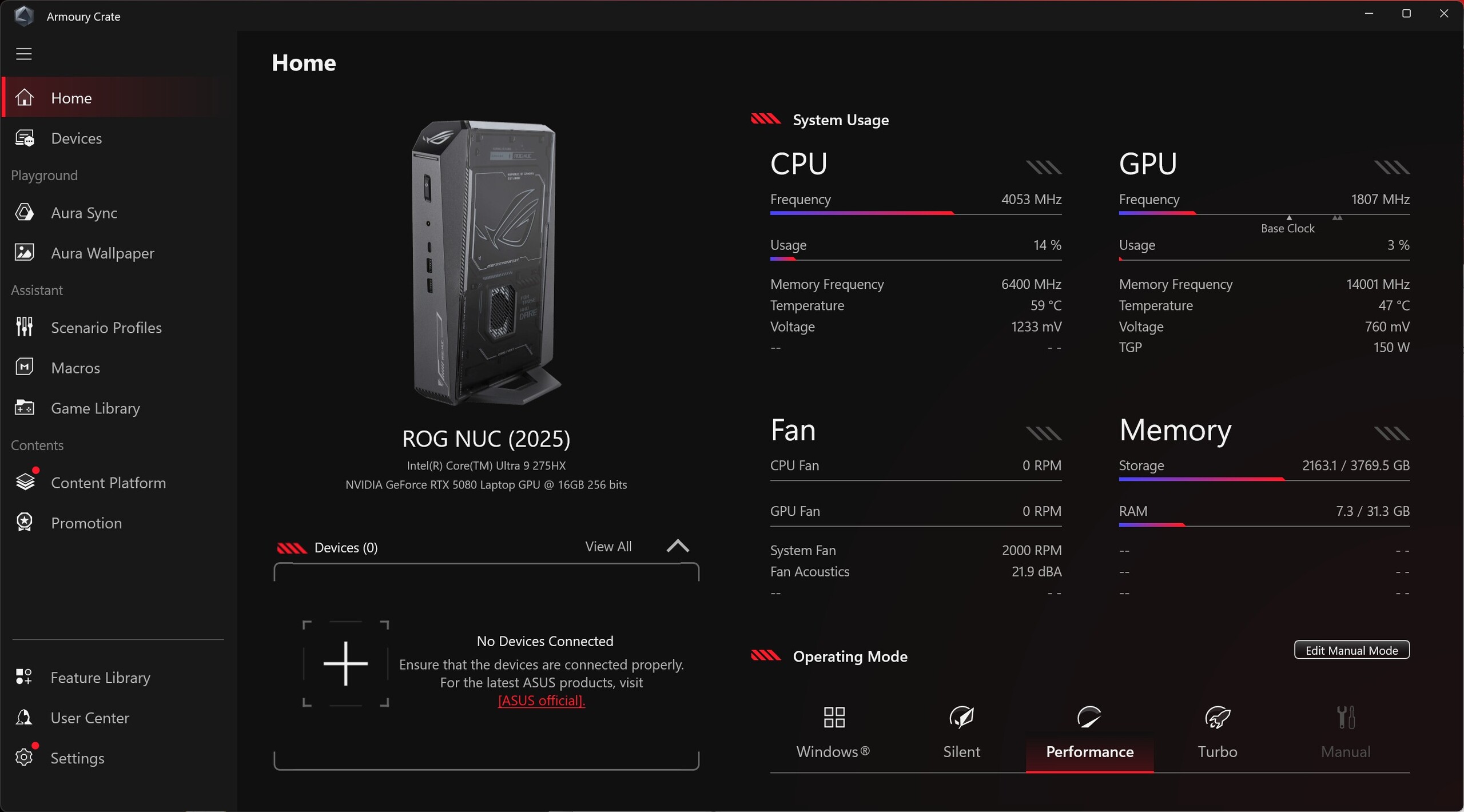 Vi använde energiprofilen "Performance" för alla prestandatester med den här enheten. Den omfattande designade UEFI erbjuder gott om utrymme för att anpassa enheten. Olika prestandaprofiler och fläktprofiler kan väljas. Prestandan kan också enkelt justeras i Windows-operativsystemet med hjälp av det välkända Armoury Crate-verktyget.