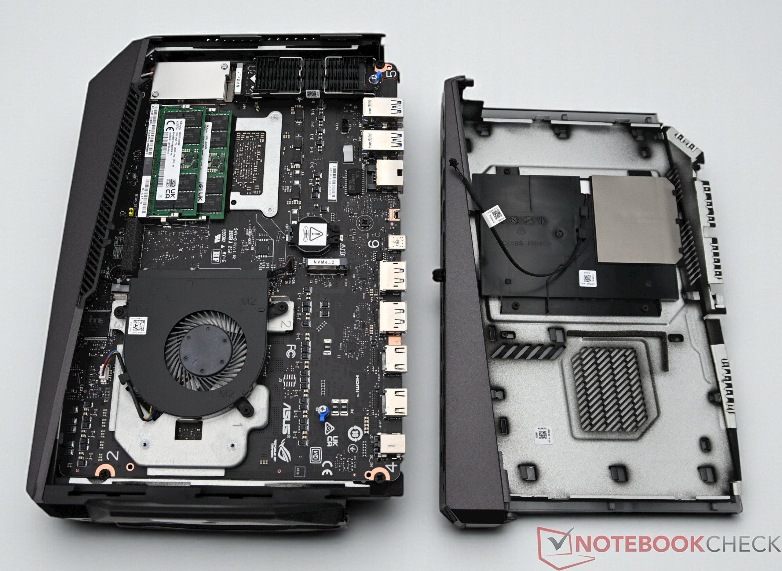 Underhållsarbete på Asus ROG NUC 15 är möjligt utan problem. Asus avstår från komplicerade skruvanslutningar så att RAM och SSD är lätta att komma åt. Efter att ha tagit bort sidopanelen finns det plats för upp till två M.2 SSD-enheter. WLAN-modulen kan också bytas ut vid behov.