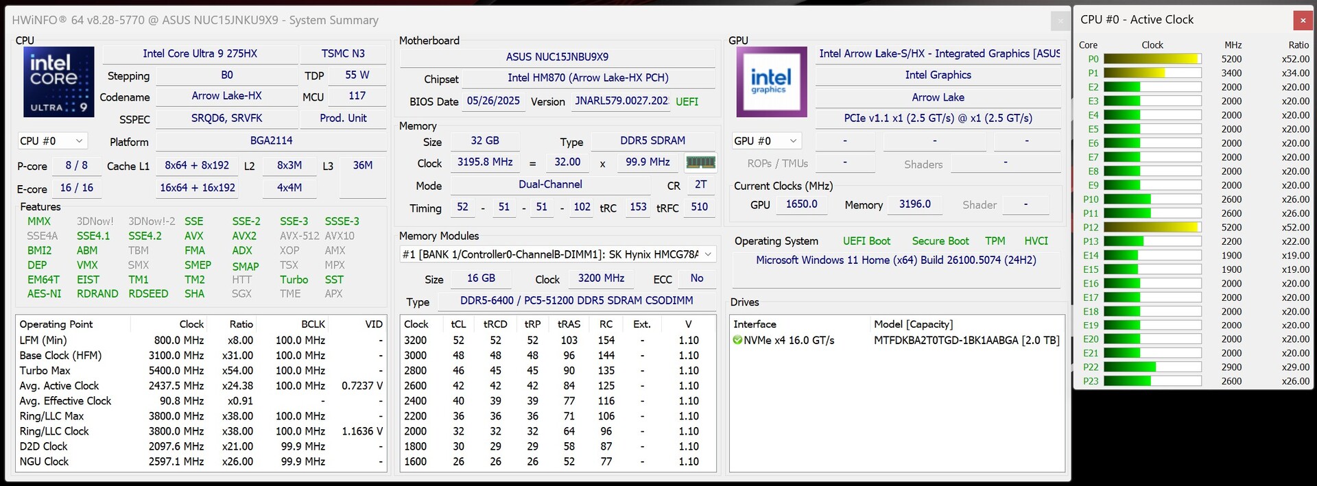 Asus ROG NUC 15 visar på ett imponerande sätt hur mycket spelkraft som kan packas in i ett litet chassi. På bara 2,5 liter kombinerar Asus modern high-end hårdvara med effektiv kylning och en attraktiv design. Intel Core Ultra 9 275HX arbetar tillsammans med Nvidia GeForce RTX 5080 laptop GPU i den visuellt förbättrade ROG NUC 15 - en kombination som klarar även krävande spel i Full HD och ofta även i QHD på ett smidigt sätt. Aktuella tekniker som DLSS 4 och Frame Generation stöds också och säkerställer betydligt högre bildfrekvenser och en smidigare spelupplevelse. ROG NUC 15 imponerar med ett utmärkt samordnat helhetspaket, som erbjuder många externa gränssnitt samt användarvänliga alternativ som justerbara prestandaprofiler med ett klick på en knapp.