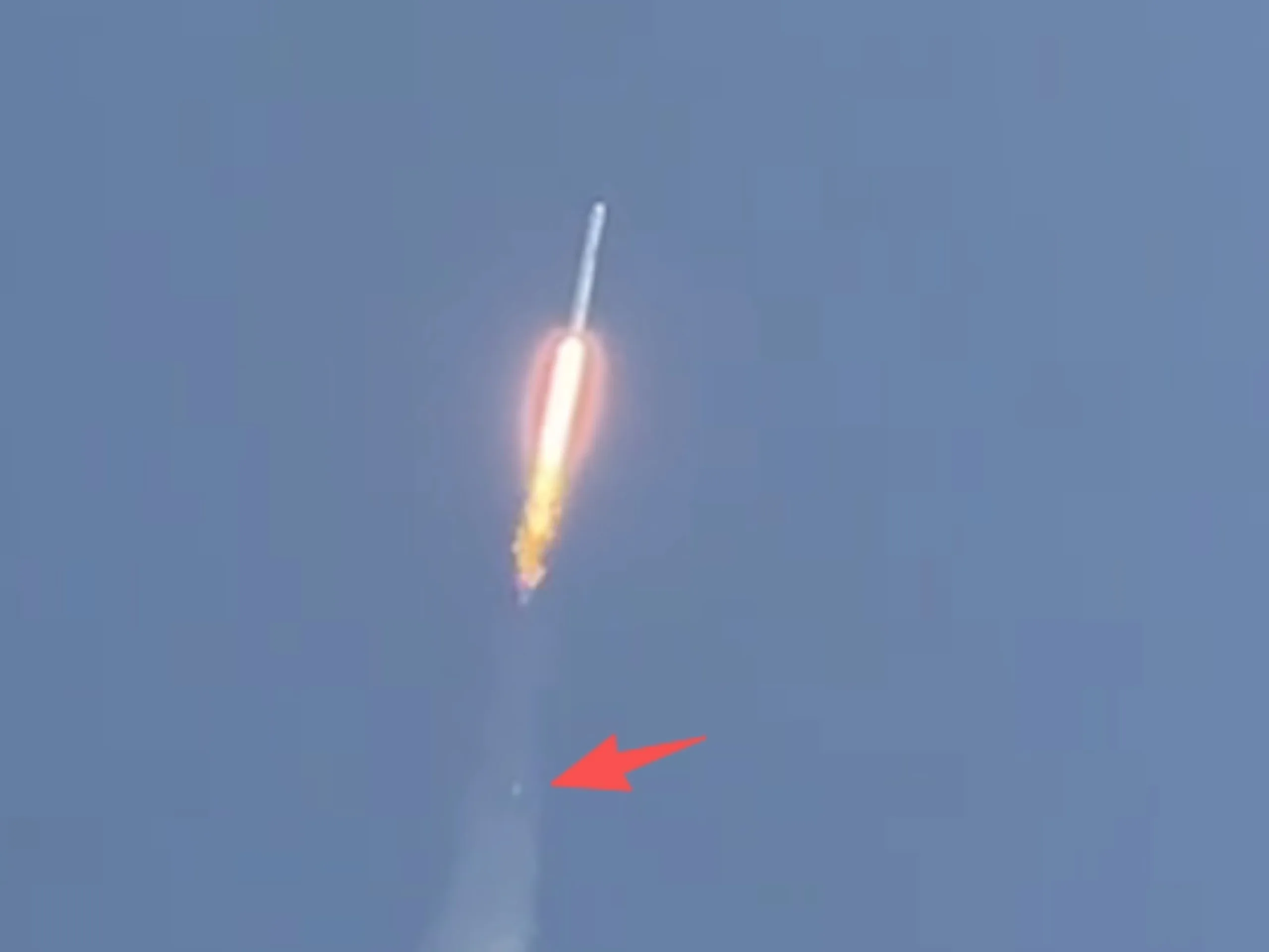 Efter cirka två minuters flygning uppstod uppenbarligen ett problem i framdrivningssystemet. De första bilderna tyder på att en explosion kan ha inträffat i närheten av en av motorerna. Det exakta händelseförloppet har ännu inte bekräftats officiellt, men aktuella rapporter tyder på att flygbanan avvek från den avsedda kursen antingen i slutet av första stegets drift eller under övergången till andra steget. Eftersom det andra steget endast är beroende av en enda motor är det betydligt mindre feltolerant än det första.