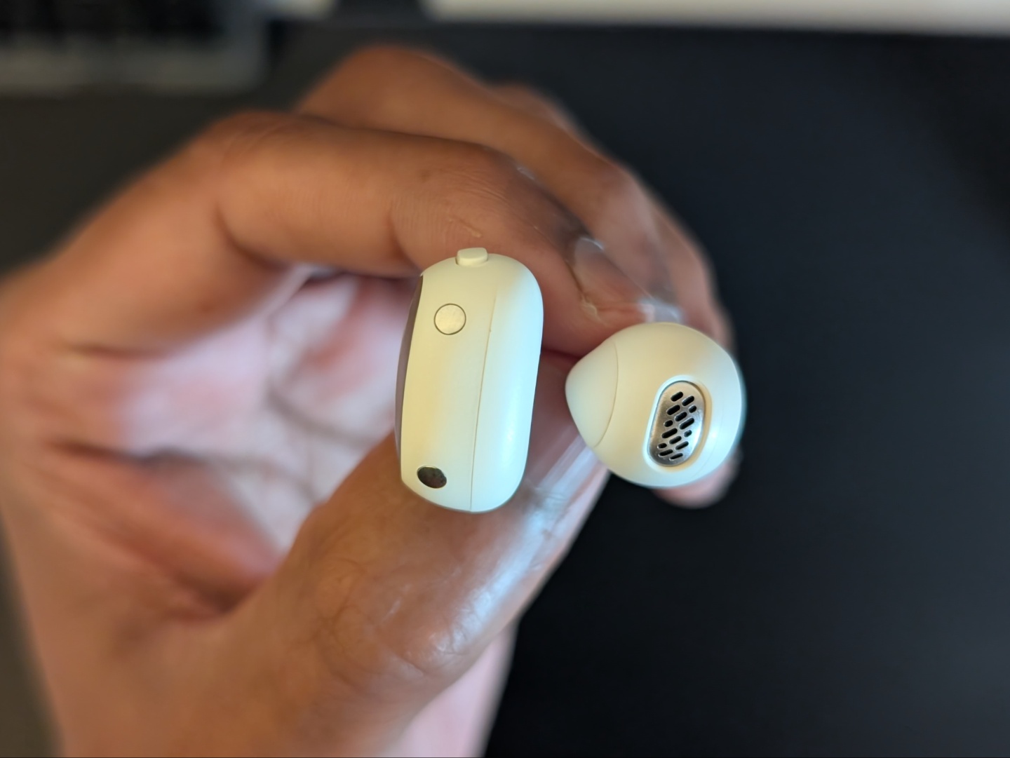 Den fysiska knappen är lätt att hitta bakom örat och fungerar utmärkt. En fördel med en fysisk knapp jämfört med touchkontroller är att personer med långt hår inte behöver borsta bort den och att den kan användas även om man bär t.ex. en mössa.