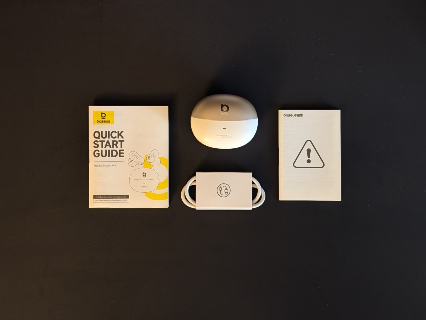 Baseus Inspire XC1 har en enkel uppackning med minimal förpackning. Eftersom dessa öronsnäckor är av clip-on-typ finns det inga öronproppar i silikon. Detaljhandelsförpackningen innehåller en snabbstartsguide och en USB Type-C-laddningskabel.