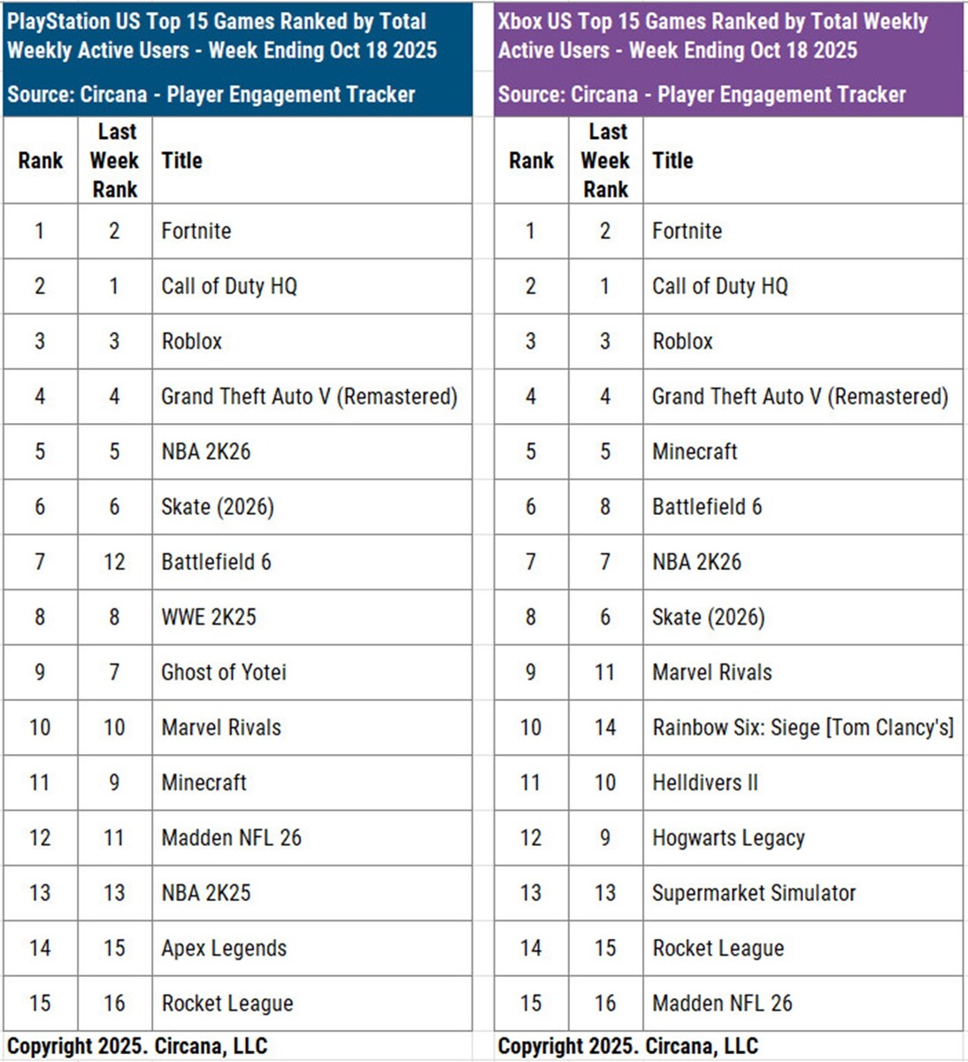Mat Piscatella delade Circana data on Blueskysom visar spelarnas engagemang på PlayStation och Xbox. Statistiken täcker veckan som slutade den 18 oktober, inklusive de första dagarna efter lanseringsdatumet för Battlefield 6. Mätning av totala aktiva användare i USA, den Call of Duty HQ rankas som nummer två bakom Fortnite. Under tiden ligger Dices nya shooter på sjunde plats på PlayStation och sjätte på Xbox-konsoler.