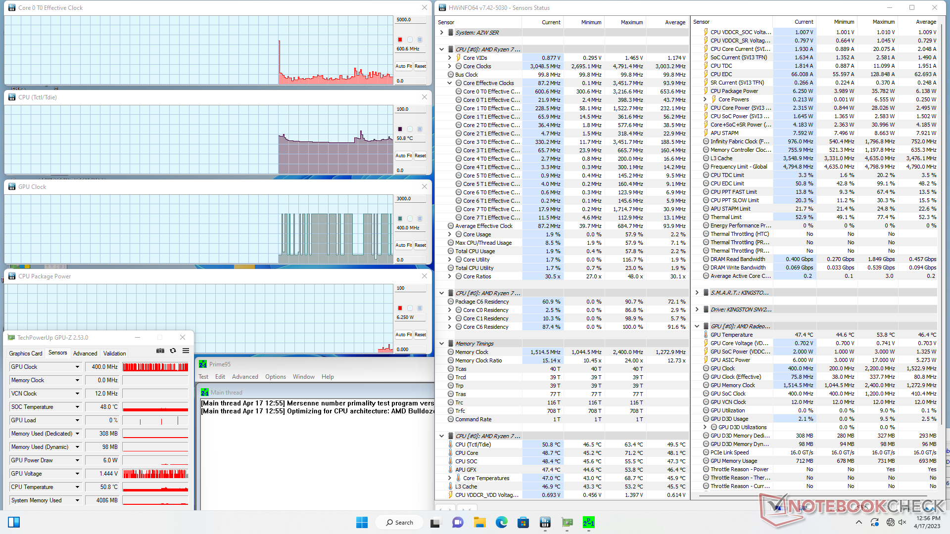 Klockfrekvensen för CPU:n och strömförbrukningen på kortet vid körning av Prime95 ökade till 3,4 GHz respektive 45 W, men det varade bara några sekunder. CPU:n skulle sedan snabbt stabilisera sig på 3,1 GHz, 38 W och 86 C därefter, vilket är något varmare och snabbare än vad vi registrerade på förra årets SER6 Pro.