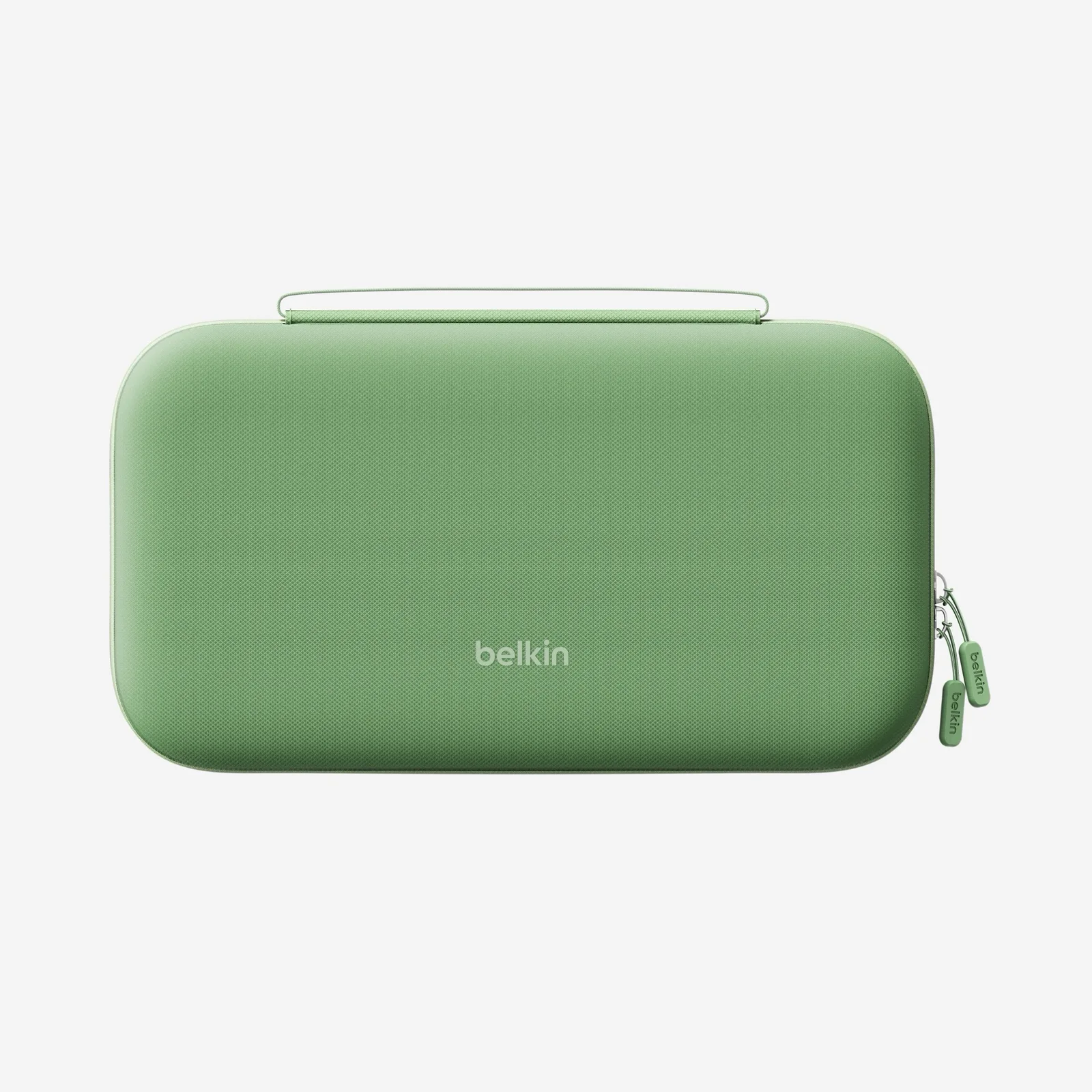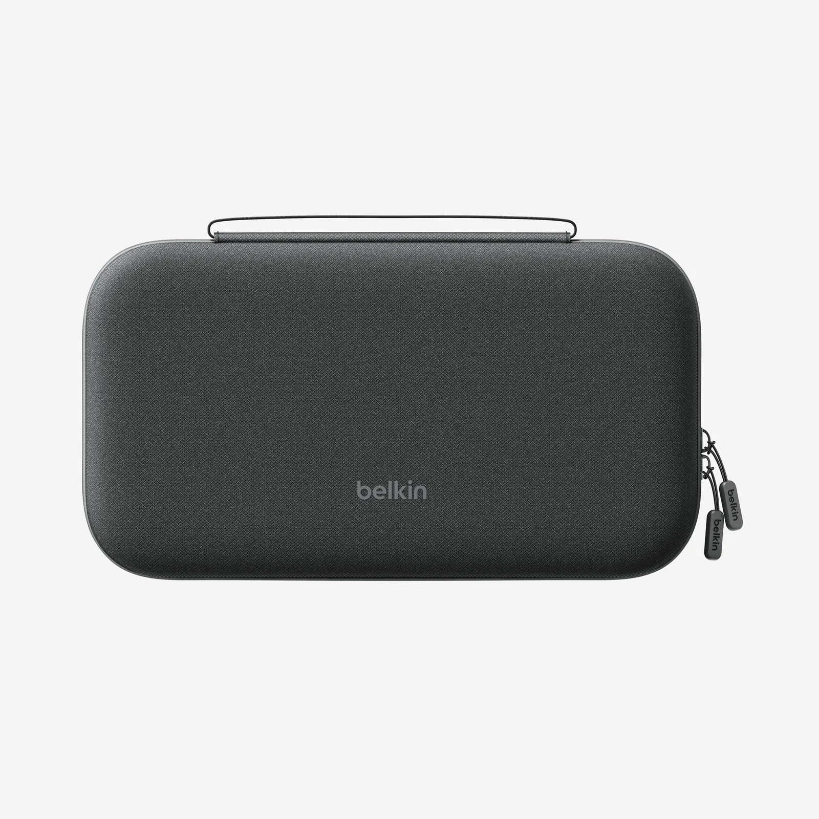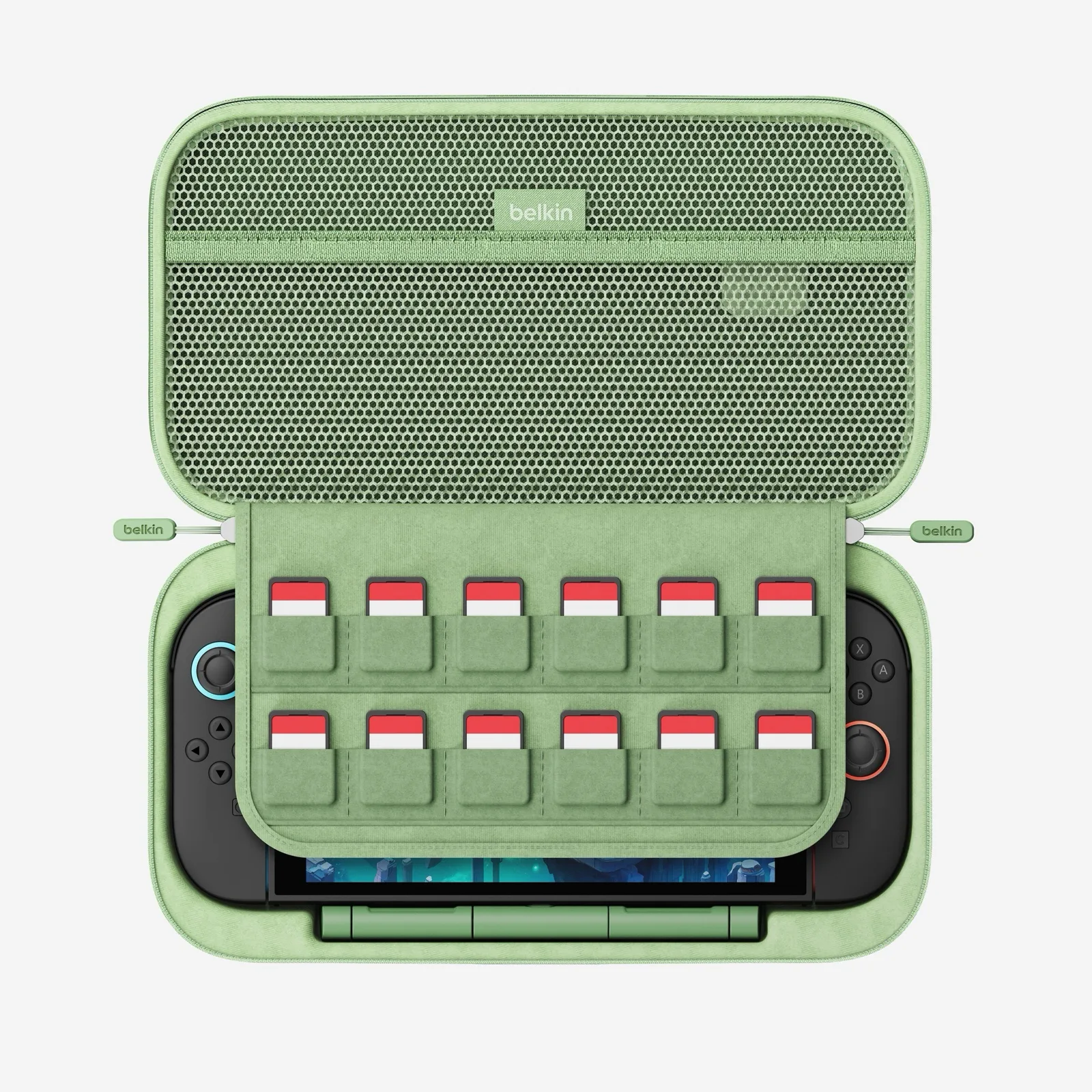 Belkin Charging Case Pro erbjuder dessutom plats för totalt tolv spelkassetter och ett fack på insidan av locket, som bland annat kan användas för kablar eller en mikrofiberrengöringsduk. Ett hårt skal ger ett optimalt skydd för Nintendo Switch 2, medan ett bärhandtag gör det enklare att transportera. Belkin Charging Case Pro laddas via en USB-C-port på framsidan.