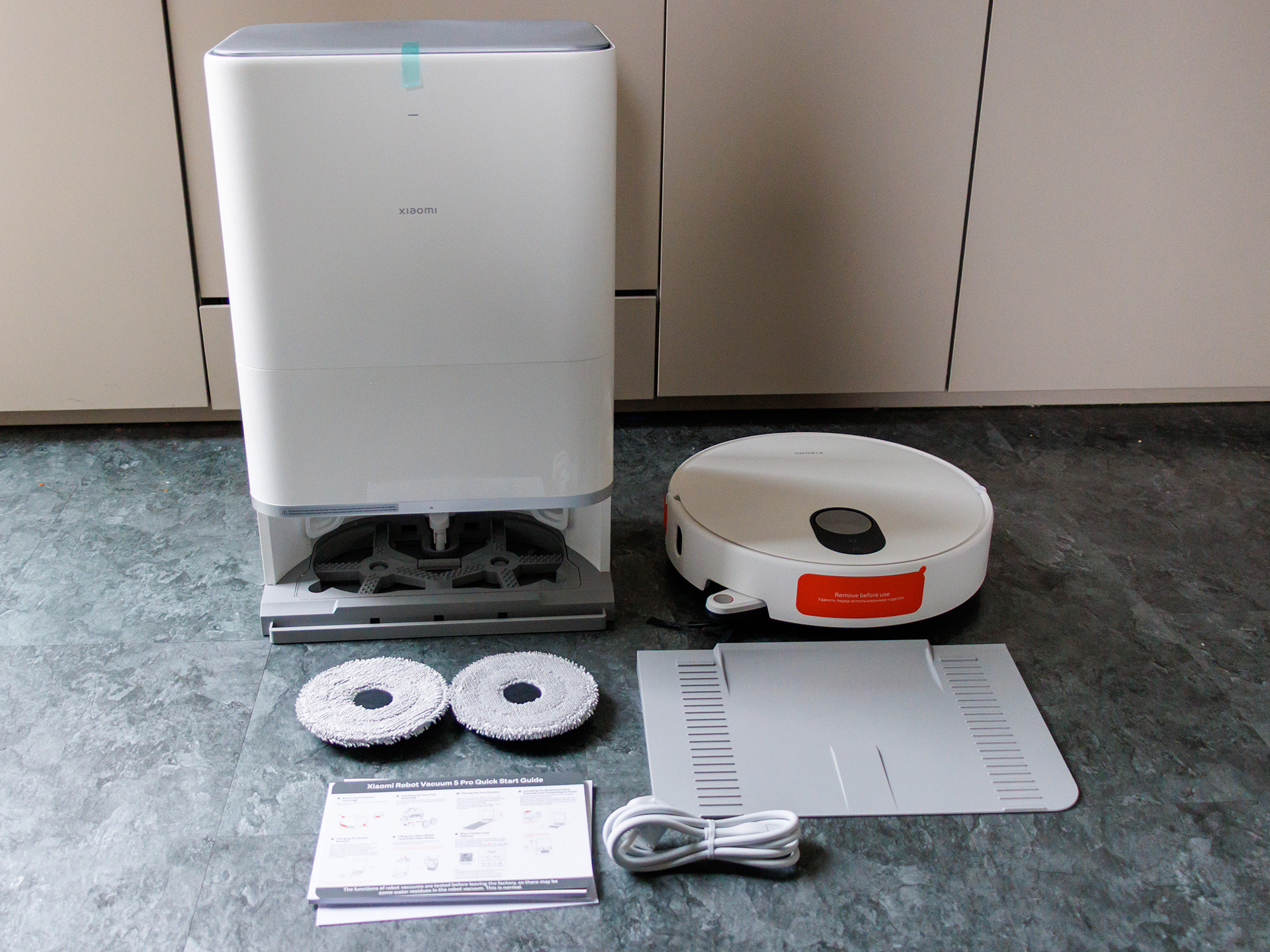 I utrustningen ingår en allt-i-ett-basstation som automatiskt tömmer dammbehållaren, rengör mopparna med vatten och sedan torkar dem med varmluft (80 °C), vilket minskar underhåll och luktbildning. Ett stort batteri möjliggör en drifttid på cirka två timmar, medan roboten vid behov återvänder till stationen på egen hand och sedan fortsätter där den slutade. Xiaomi Robot Vacuum 5 Pro styrs via Xiaomi Home-appen med karthantering, rumslayout, begränsade områden och individuella rengöringsscheman; dessutom finns vanliga röstassistenter tillgängliga för att bekvämt starta rengöring via röstkommando eller integrera den i smarta hem-scenarier.