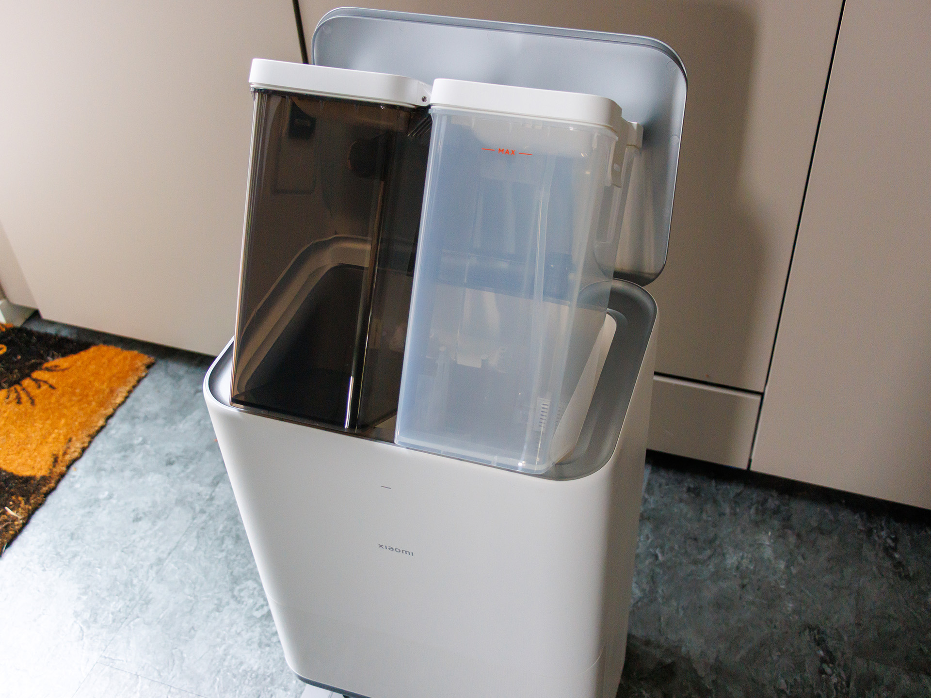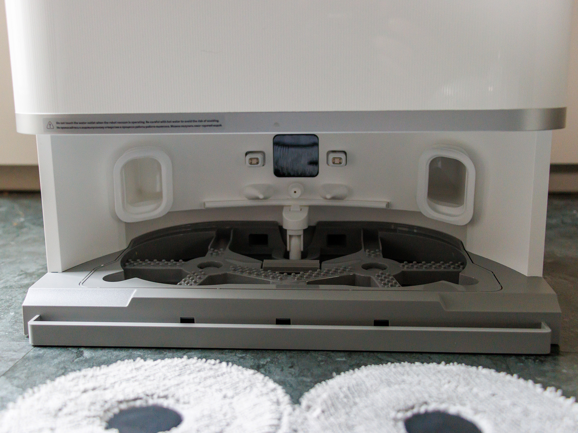Dammbehållaren är ganska liten, så robotdammsugaren/mopproboten måste återvända till laddstationen oftare när den städar stora ytor. Mopparna kan också rengöras automatiskt med 80°C varmt vatten. Tyvärr har Xiaomi Robot Vacuum 5 Pro ingen tank för rengöringslösning; istället moppar den med bara vatten. Vi tyckte att mängden vatten som användes direkt från förpackningen var ganska låg, vilket är anledningen till att vi körde större delen av testet på nivå 3. En full vattentank i laddstationen räckte till drygt 240 kvadratmeter.