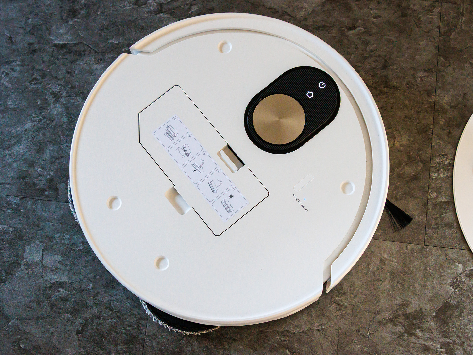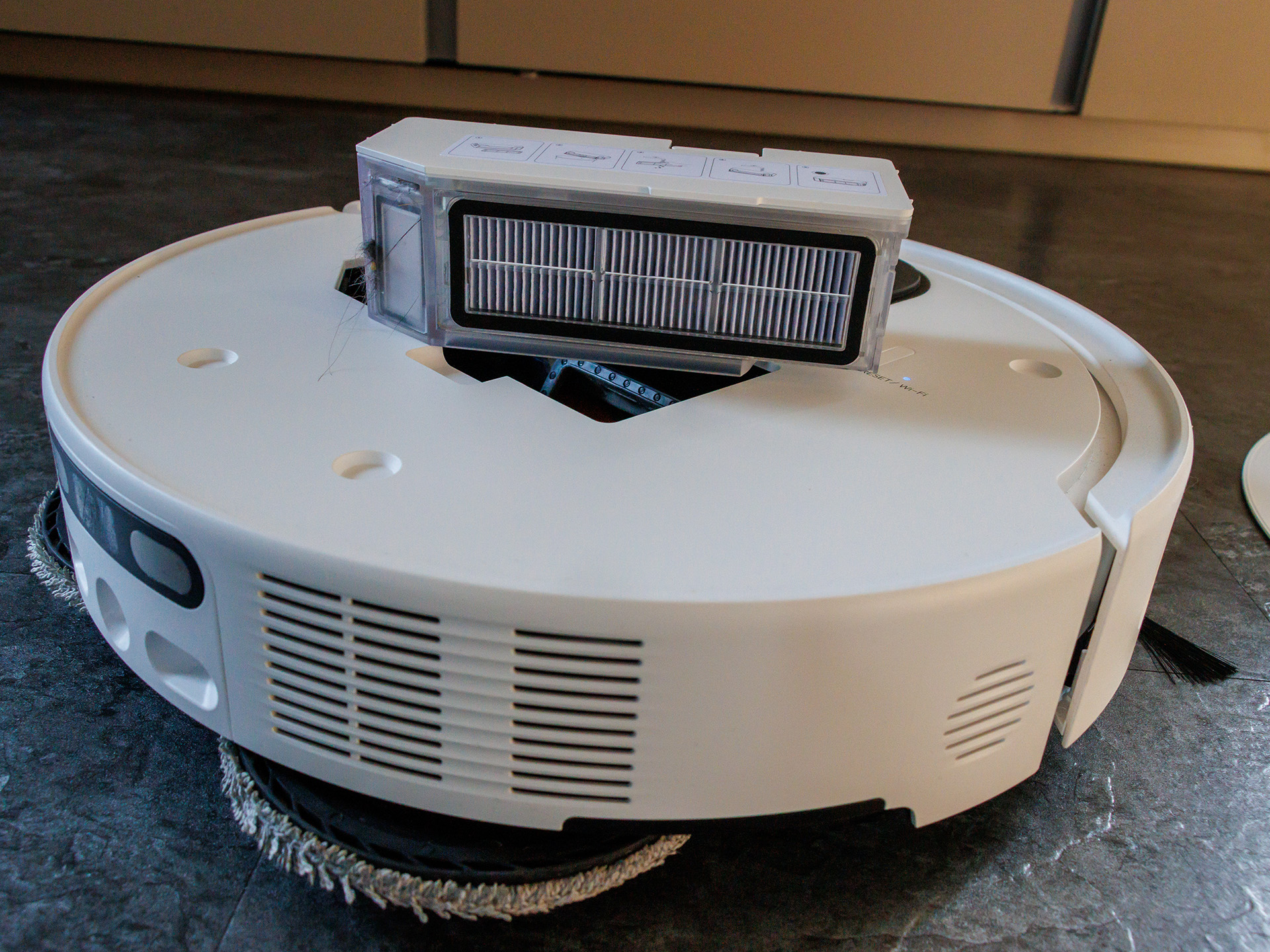 De roterande mopparna med variabel vattennivå tar bort de flesta fläckar. Om dessa redan har torkat kan det dock vara nödvändigt med en andra genomgång. Smutsavkänningen fungerar ganska bra, men ibland registrerar den fläckar som egentligen inte finns där. När man rör sig över mattor höjs mopparna automatiskt.