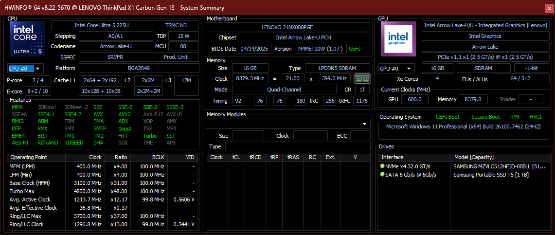 | Lenovo ThinkPad X1 Carbon Gen 13 21NX008PGE Intel Core Ultra 5 225U ⎘ Intel Graphics 4-Core iGPU (Arrow Lake) ⎘ 16 GB Minne, 512 GB SSD | Amazon: $1,649.99 Listpris: 1955 Euro | 1.2 kg | 17.5 mm | 14.00" 1920x1200 162 PPI IPS LED | |