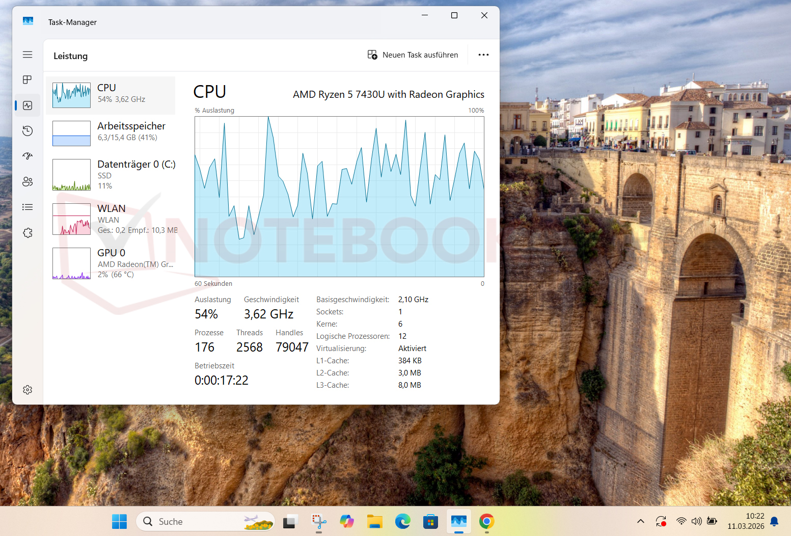 Windows Task Manager ger en första indikation. Här kan du se både klockfrekvenser och CPU-cacher. Den nya Ryzen 5 7430U har en maximal boostklocka på 4 300 MHz och 16 MB L3-cache och kommer från Zen 3-processorserien, med kodnamnet "Barcelo-U". I uppgiftshanteraren för vårt prov skiljer sig dock informationen. Även om CPU-namnet anges som Ryzen 5 7430U, kodnamnet "Lucienne-U" (Zen 2-arkitektur), L3-cache på 2x 4 MB och den observerbara turboklockan på max. drygt 4 000 MHz indikerar inkonsekvenser. Dessa specifikationer motsvarar Ryzen 5 5500U-chip.