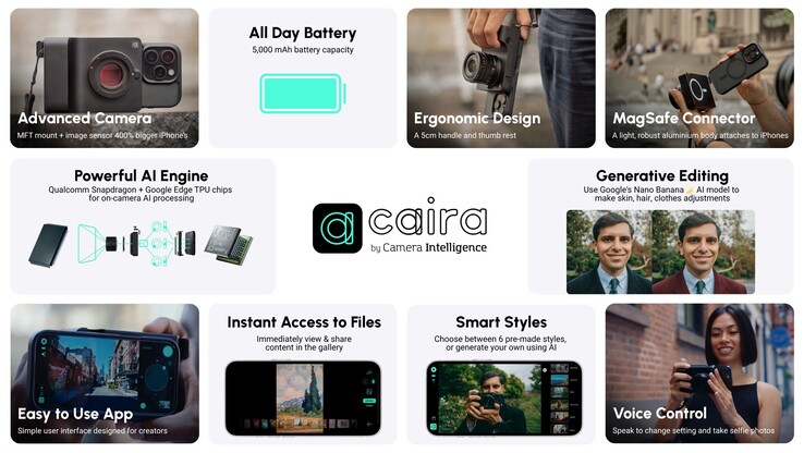 Caira marknadsförs som en omfattande kamerauppgradering för Apple iPhone. Kameran fästs magnetiskt på mobilen via MagSafe och har en FourThirds-sensor som enligt tillverkaren är 400% större än sensorn i Apple iPhone 17 Pro:s huvudkamera.