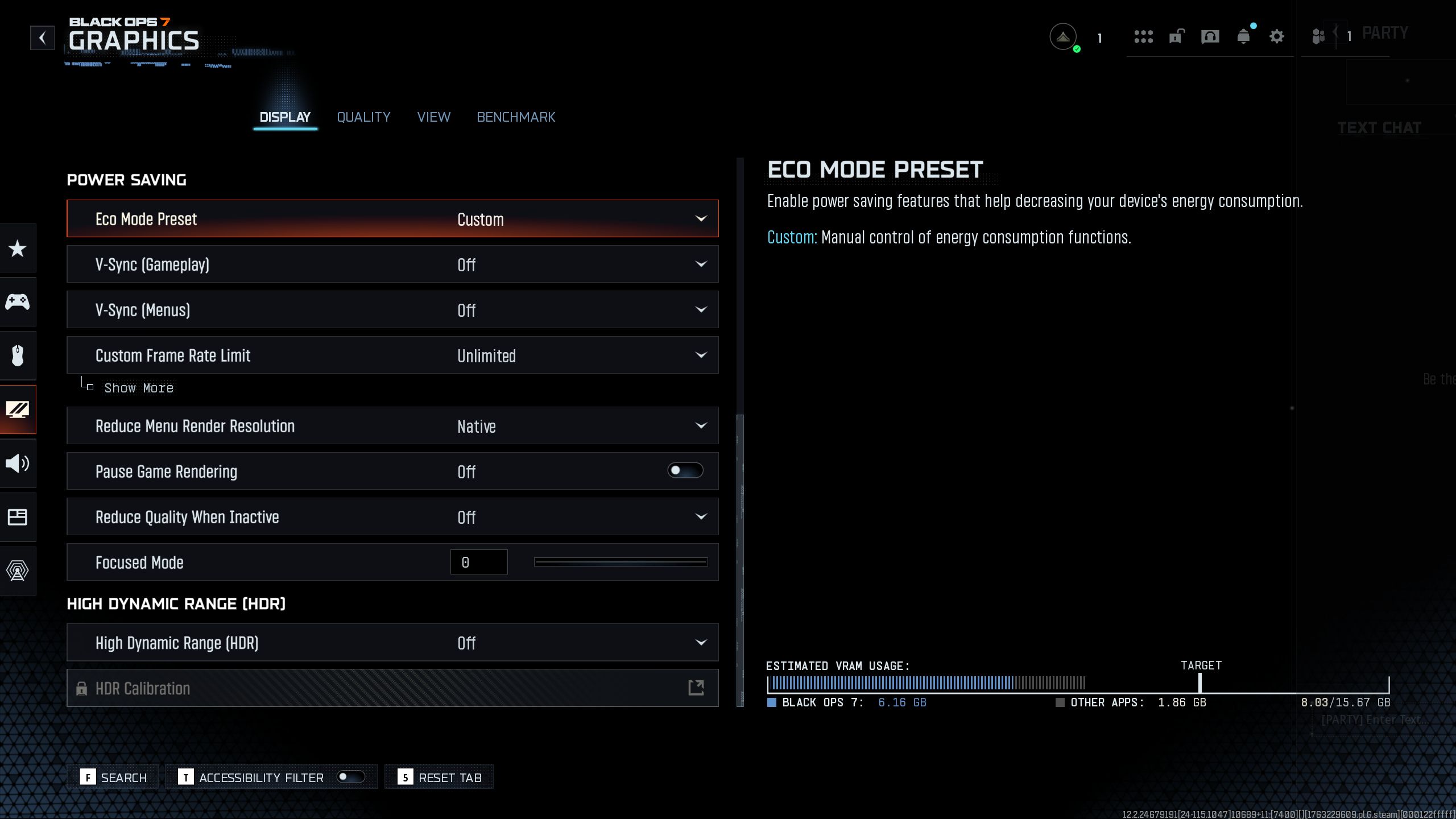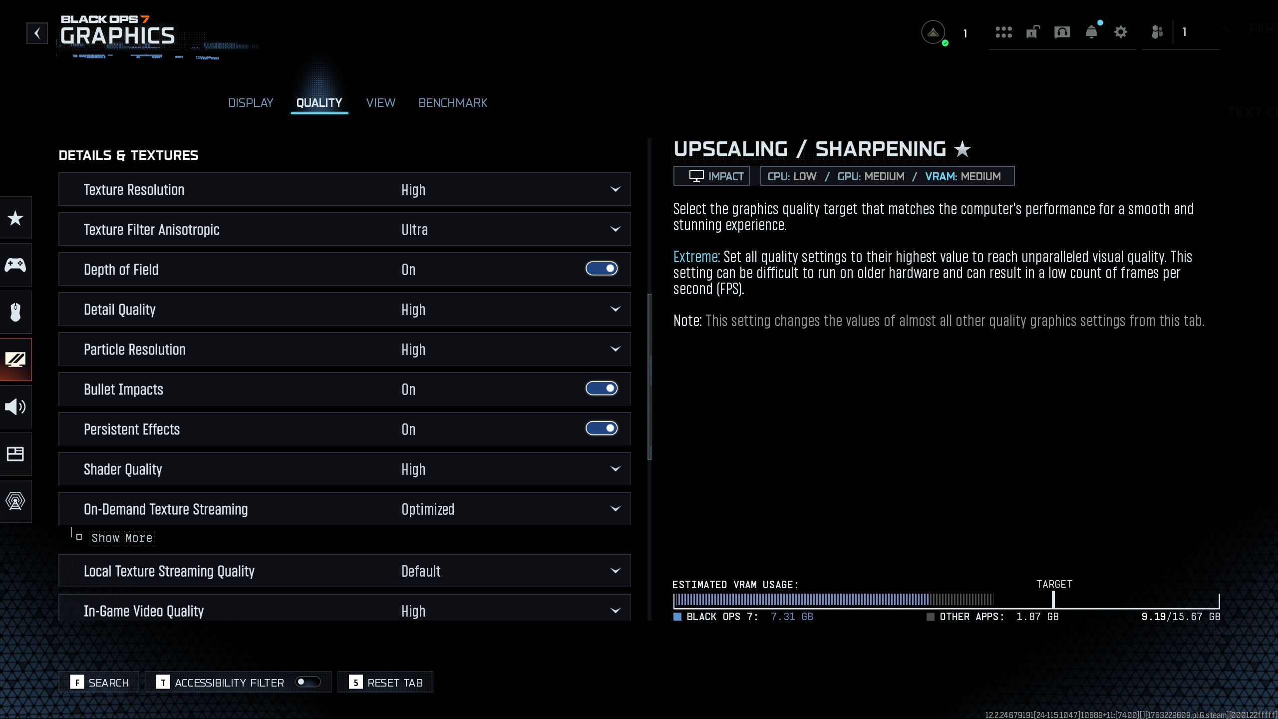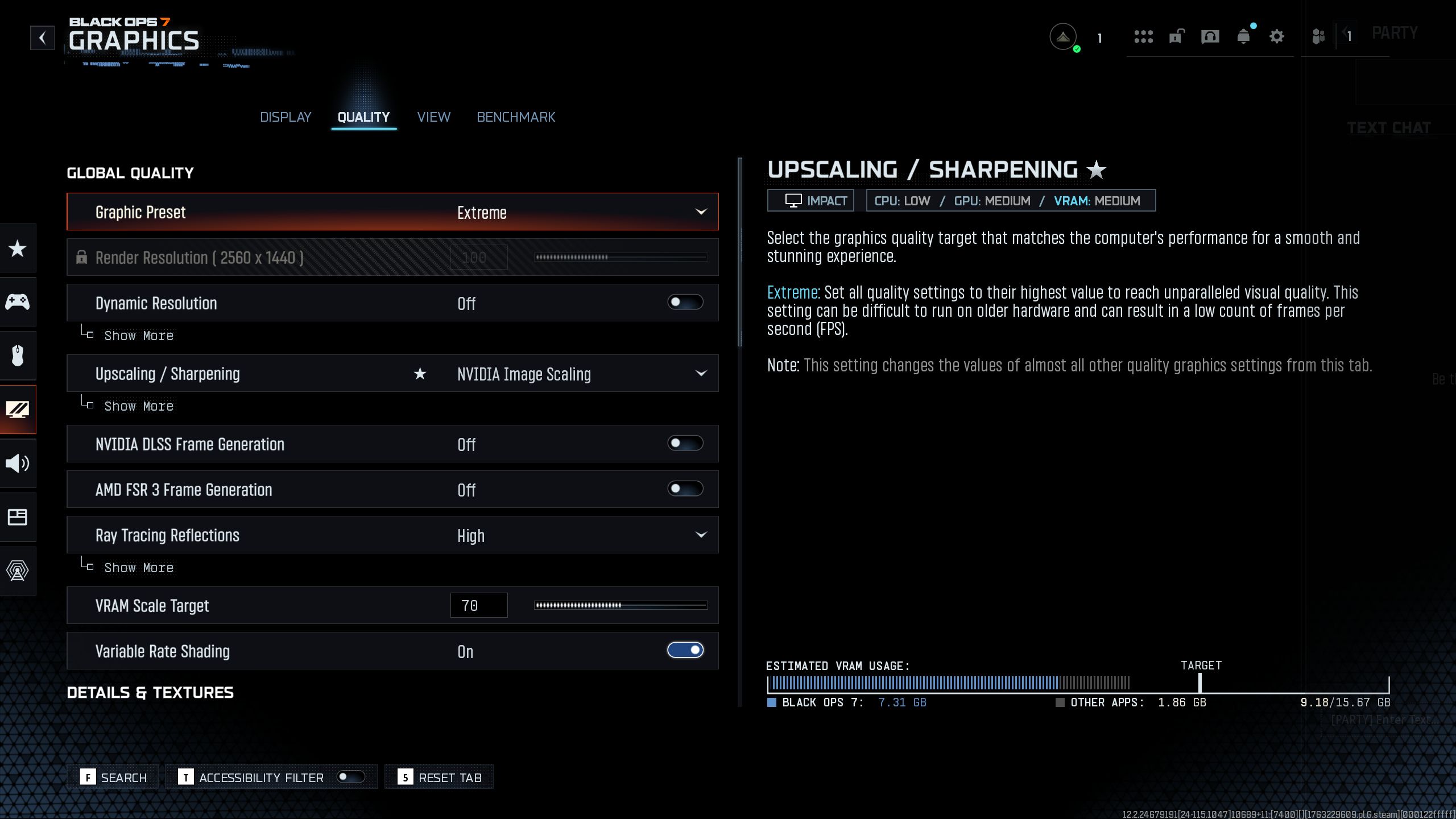 Liksom de flesta nuvarande spel är Call of Duty: Black Ops 7 ganska VRAM-hungrig utan att nå nivån på vissa Unreal Engine 5-spel (se Borderlands 4). Till exempel kräver maximala inställningar vid QHD-upplösning cirka 8 GB VRAM. Det bästa är att inställningsändringar tillämpas direkt utan omstart.