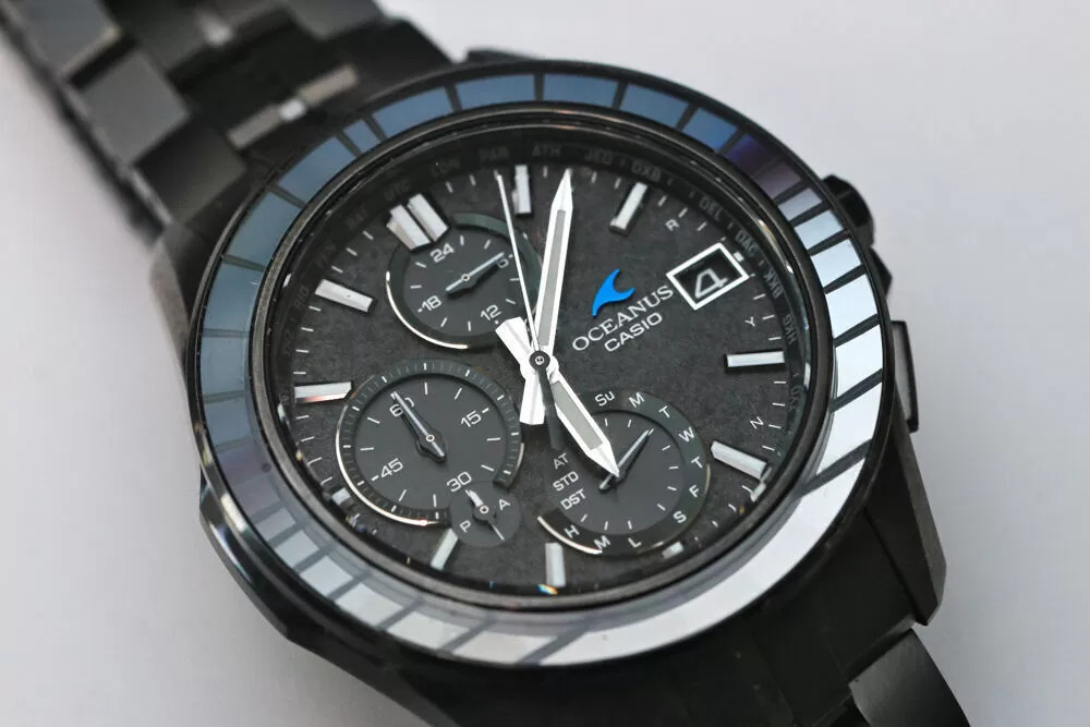 Urtavlan är också mer intressant på de här riktiga bilderna. Istället för att se platt och enhetlig ut har ytan en texturerad, nästan stenliknande yta som skiftar i ljuset. Underuppringningarna och markörerna framträder tydligare, och det inramade datumfönstret vid klockan fyra ser mycket mer raffinerat ut i verkligheten. Den ljusblå Oceanus-våglogotypen är slående mot den svarta bakgrunden - mycket tydligare än på de ursprungliga pressbilderna.