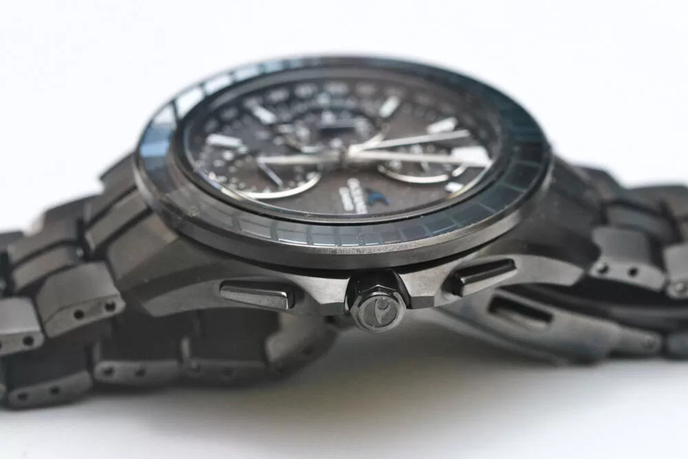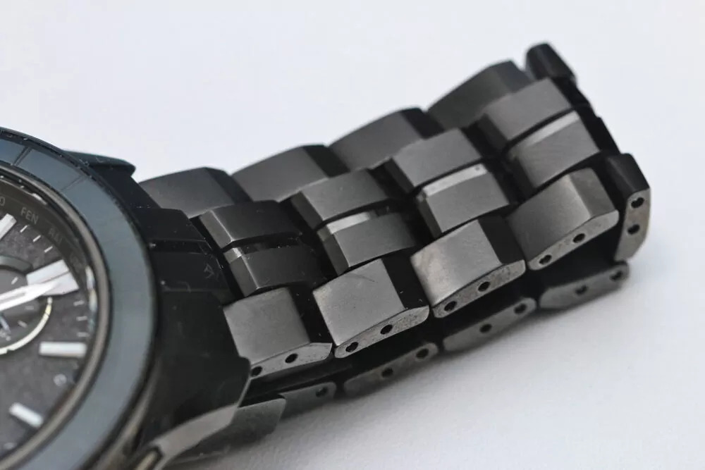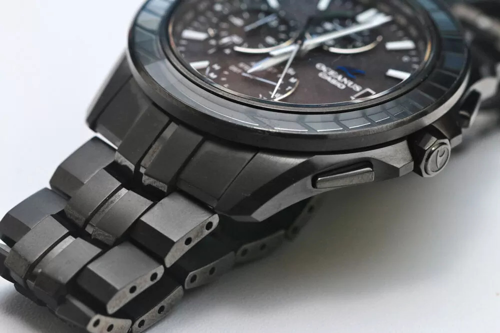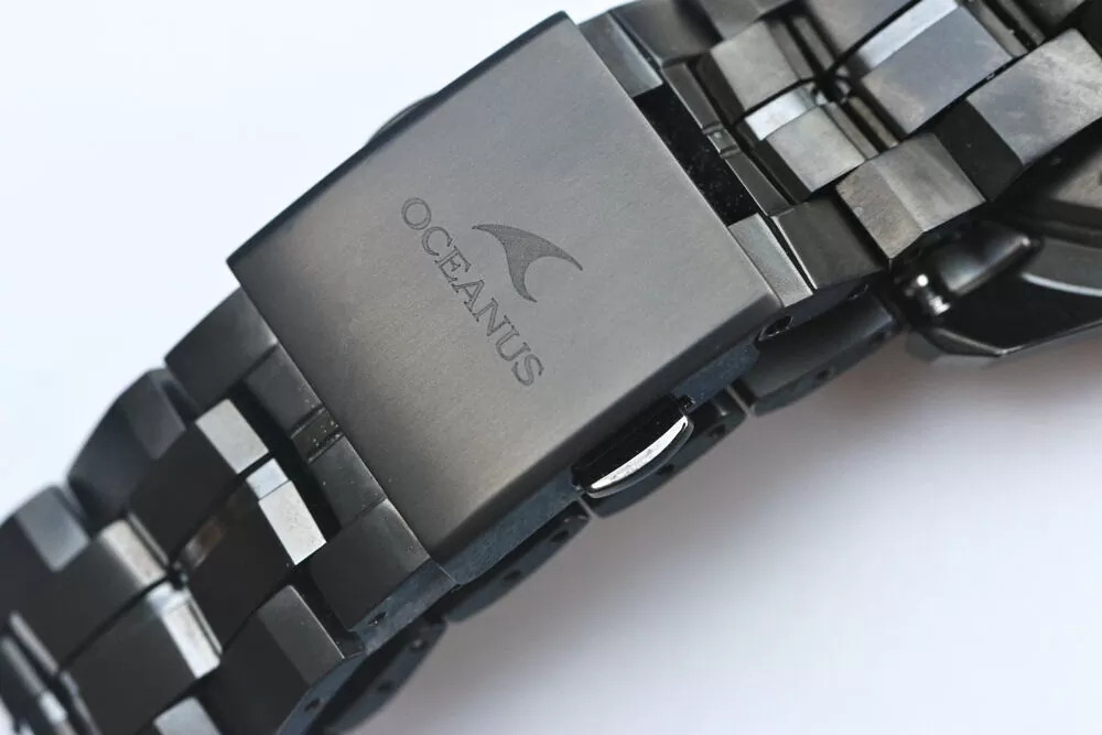 Det första som fångar uppmärksamheten är boetten och armbandet. Klockan verkar vara helt byggd i titan med en svart DLC-finish, och närbilderna visar skarpare kanter och mer komplex bearbetning än vanligt. Armbandets länkar har märkbart vinklade fasetter, och borstningen ser djup ut snarare än lätt målad på. På bilden av låset syns också en snyggt graverad Oceanus-logotyp, med en matt textur som kompletterar den reflekterande poleringen runt omkring.
