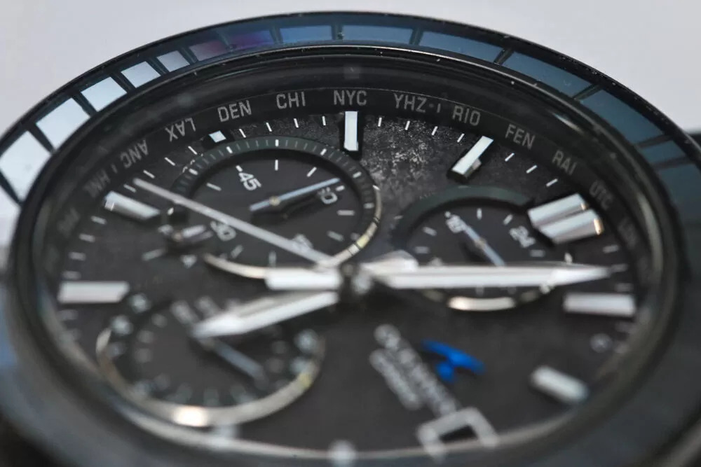 Men det viktigaste man kan se från dessa vinklar är safirluckan, som kommer att vara ett stort försäljningsargument för den här klockan. Fasetterna runt boetten fångar upp ljus och skiftar mellan mörkblå och silverfärgade toner beroende på vinkeln. Det är den typ av detalj som inte riktigt går att översätta till renderingar i studion, men som ser imponerande ut i verkligheten. Du kan också se förkortningarna för världsstäderna under den inre kanten av ramen - NYC, RIO, DEN, HNL och andra.