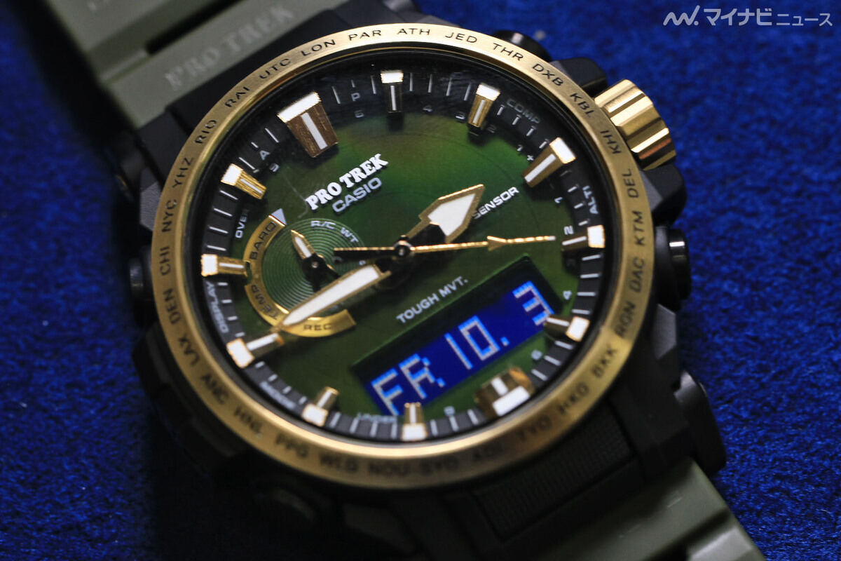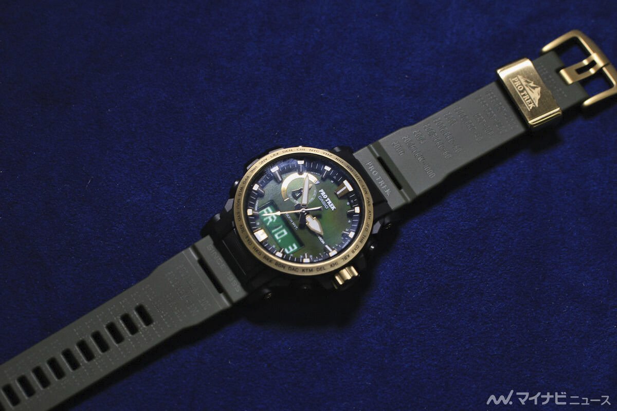 PRW-61ANS-3, i närmare belysning, avslöjar en rik olivgrön urtavla med mycket djup. De ångdepositionerade indexen och visarna i guld fångar ljuset med ett skimmer, vilket i sin tur får de analoga elementen att framträda utan att verka alltför reflekterande. Även den digitala subdial sitter renare nu. Den är tydligare inramad i den nedre delen av urtavlan. Det är också lättare att se den radiella texturen under Pro Trek-logotypen.