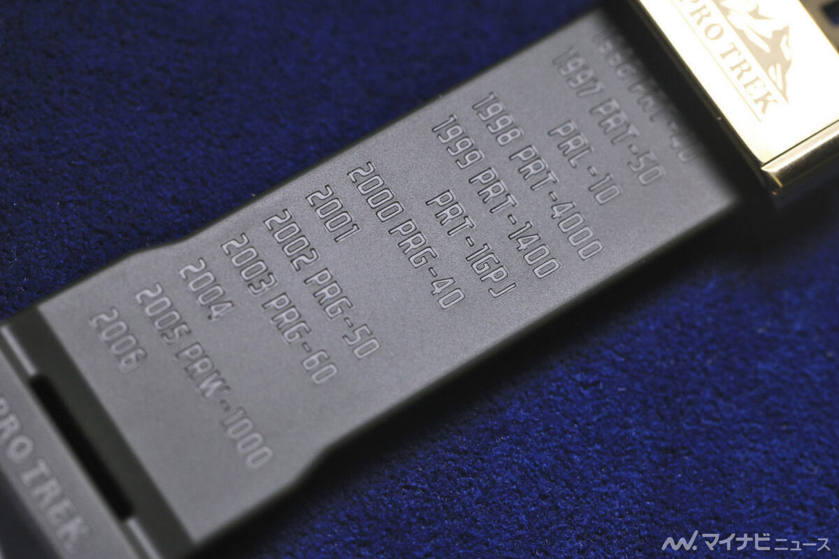 Det som verkligen sticker ut i den här nya bildserien är armbandsbehandlingen. En närmare titt på det gjutna hartset avslöjar skarpare årsmarkeringar i Pro Trek-tidslinjen, från de tidigaste modellerna på 90-talet till de ikoniska utgåvorna på 2000-talet. Teckensnittets storlek och stämplingens kvalitet verkar vara konsekvent för båda modellerna, men olivfärgen på PRW-61ANS-3:s band ser ut att vara en aning djupare i naturligt ljus - möjligen på grund av materialets struktur. Det guldfärgade spännet och hållaren är också lite mindre flashiga nu.