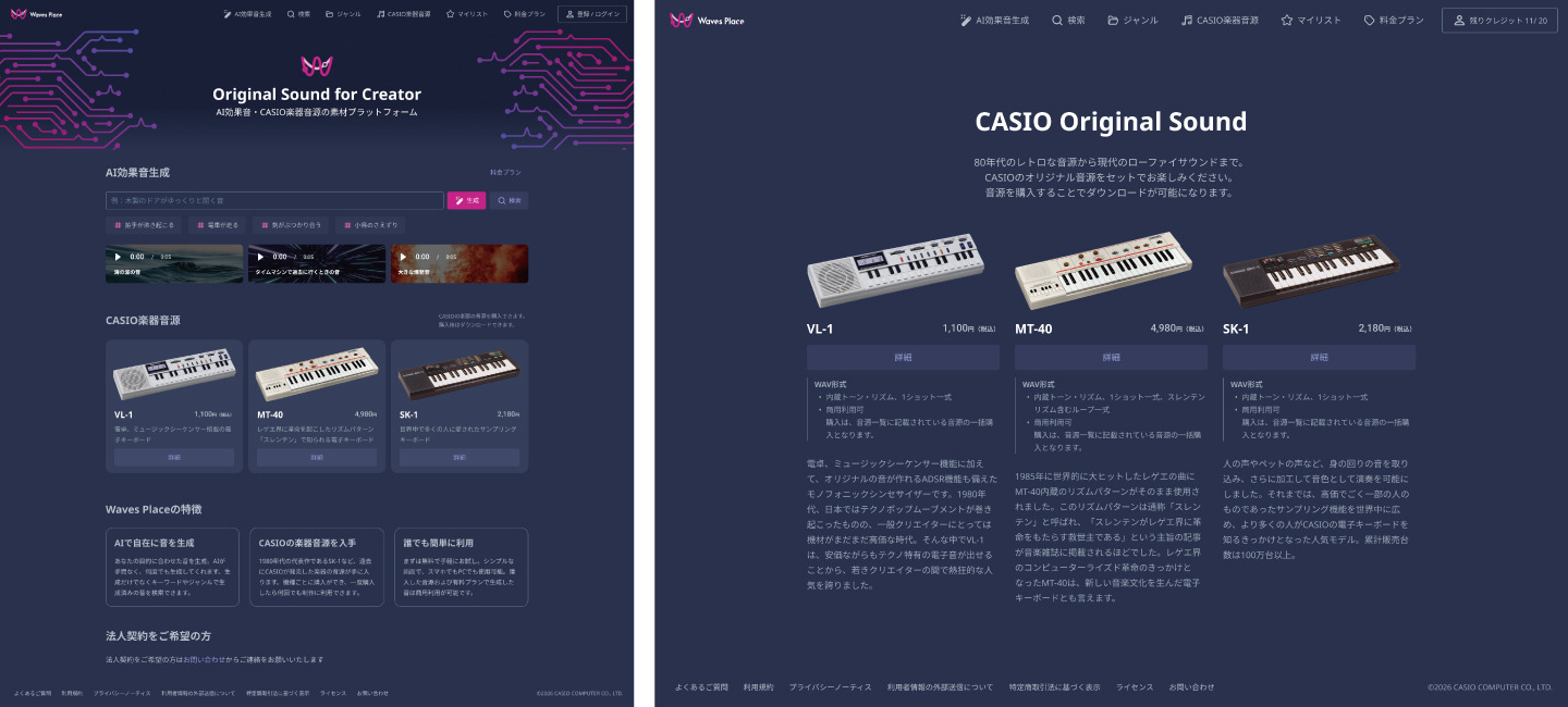Casio Computer Co., Ltd. har börjat sälja officiella ljudkällor från tre av sina klassiska elektroniska keyboards från 1980-talet via Waves Place, en tjänst för generering av AI-ljudeffekter. De nya utgåvorna på https://www.casio.co.jp/release/2026/0324-wavesplace/ inkluderar ljud från Casio VL-1, Casio SK-1 och Casio MT-40. Alla tre paketen gick live den 25 mars.