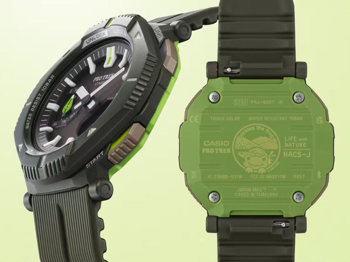 Casio har presenterat Pro Trek x The Nature Conservation Society of Japan x Pickles the Frog samarbetsklocka i Japan. Klockan, som också är känd under modellnummer PRJ-B001NJ-3JR eller PRJ-B001NJ-3, har en grön design med blinkningar till den populära grodkaraktären, som är Nature Conservation Societys maskot.
