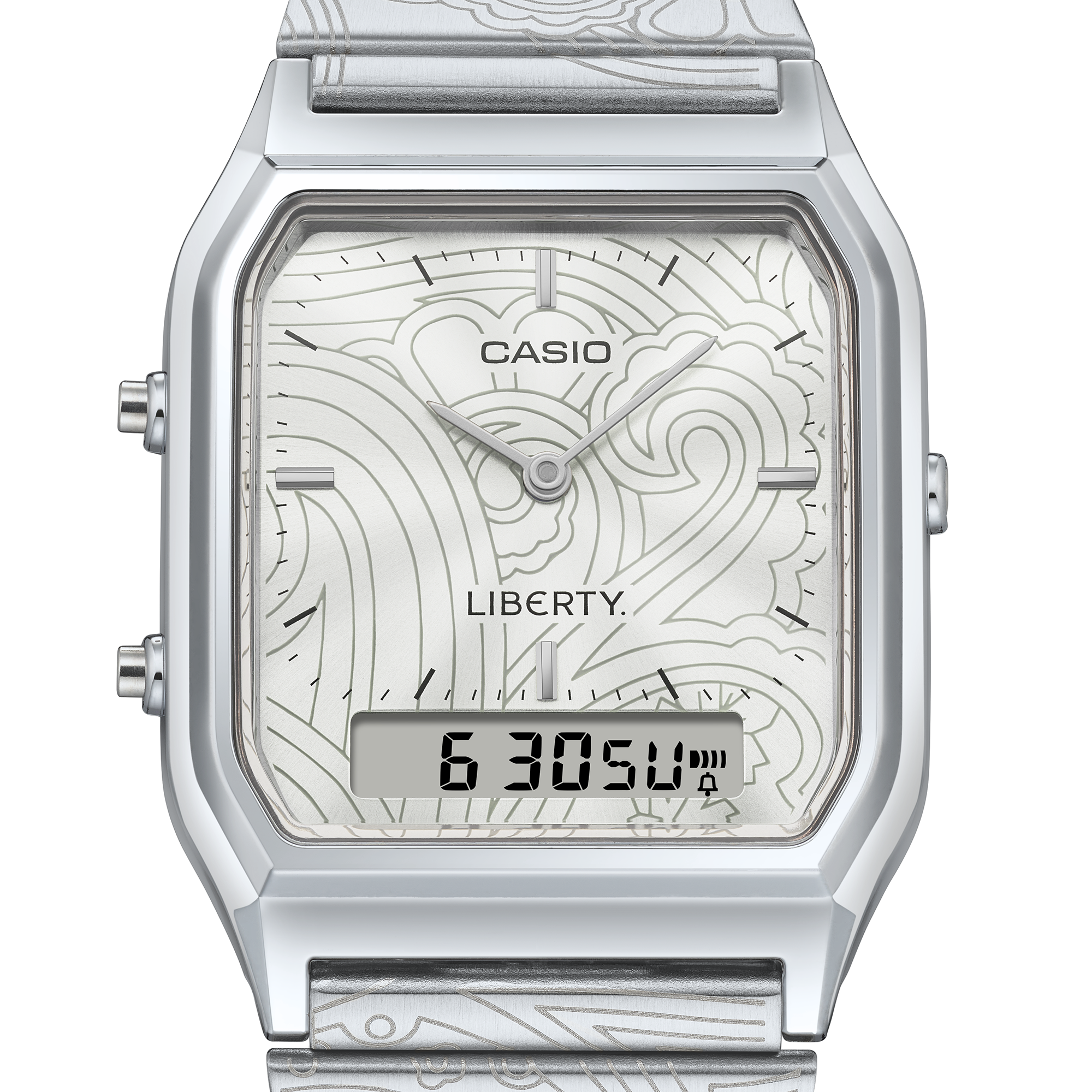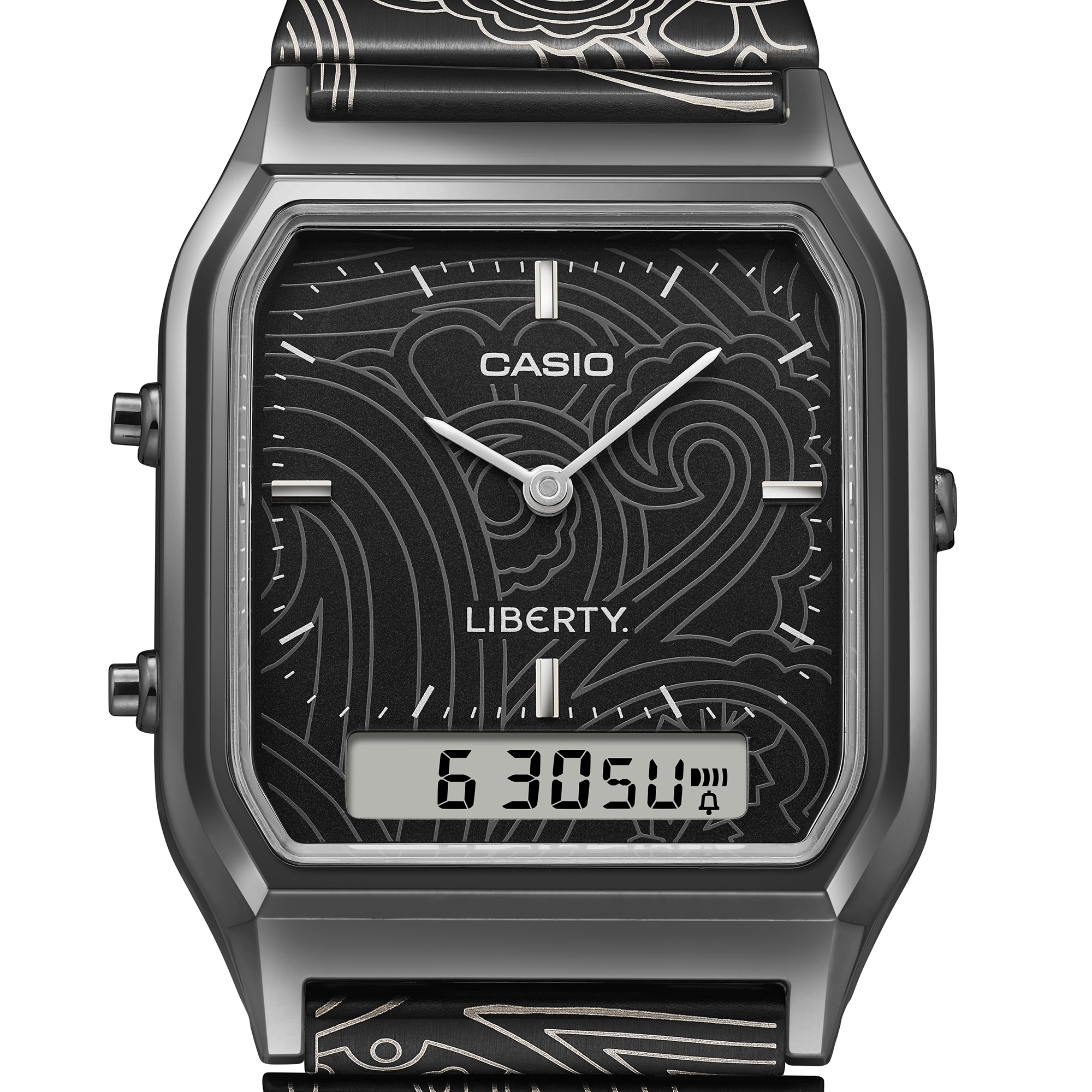 Casios Vintage x Liberty-klockor har det brittiska varumärkets ikoniska Paisley Fanfare-tryck lasergraverat över urtavlan och remmen. Varje klocka har ett pläterat hartshölje som mäter 38,8 x 29,8 x 8,1 mm (~1,5 x 1,2 x 0,3 tum) och levereras med ett rostfritt stålband. Klockan ska hålla i cirka tre år med batteri och marknadsförs även som vattentålig.