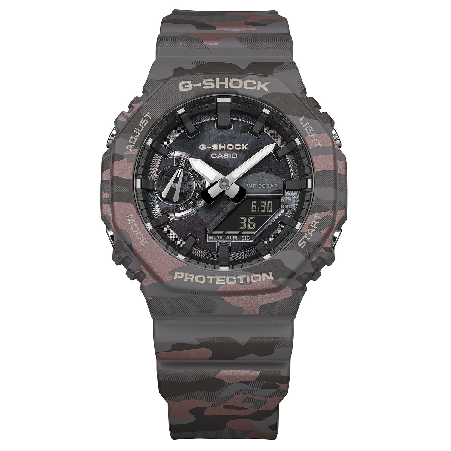 Casios GA-2100-serie, som kännetecknas av sin åttkantiga ram och hybrid analog-digital display, får nu officiellt tre nya färgställningar: sand (GA-2100CM-5), grå (GA-2100CM-8) och en tredje variant med rödaktiga toner (GA-2100CMD). Det finns också metalltryck på hartskomponenterna. Denna tillverkningsprocess ger en kamouflageeffekt i flera lager som inkluderar varumärkesidentifieraren - G-märket - integrerat direkt i mönstret. Medan tidigare iterationer av GA-2100 använde gjuten färgharts eller standard pad-utskrift, är användningen av metalldetaljer på dessa modeller avsedd att ge en högre grad av visuellt djup jämfört med standardvarianter.