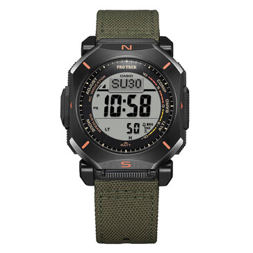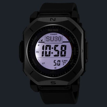 Detta är en Triple Sensor-klocka. Den innehåller en digital kompass, höjdmätare (-700 till 10.000 m), barometer med tryckutvecklingskurva och termometer. Den duplexa LCD-skärmen är nyckeln här - kompassgrafik har lagts ovanpå huvuddisplayen för enklare navigering i realtid. Casio säger att kompassen kan köras kontinuerligt i upp till 60 sekunder och att riktningsspårningen visas dynamiskt.