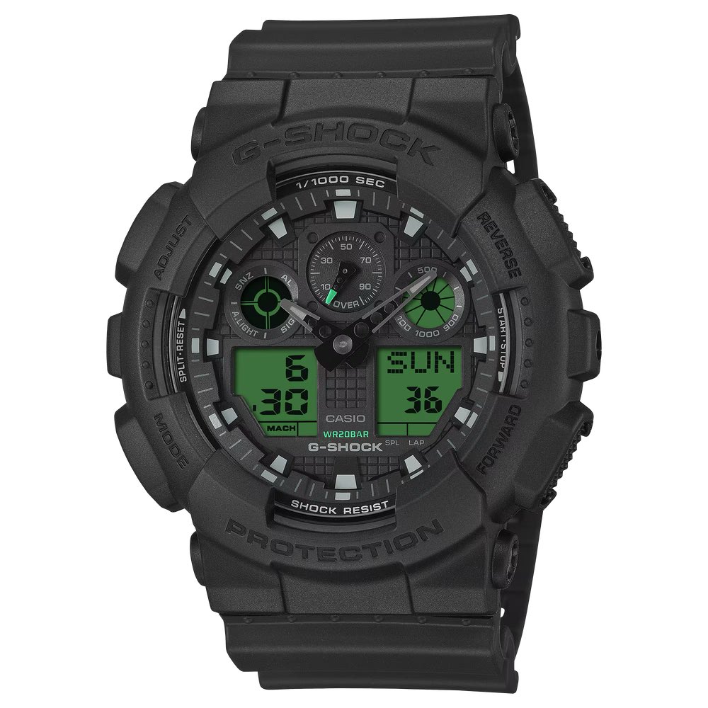 Nästa modell är GA-100BEG-1A (¥18 700). Denna robusta digital-analoga modell har Casios klassiska trippelgraf-layout, med dubbla elektrogröna LCD-paneler längst ned för att effektivt kontrastera det smygande svarta höljet. Den har grönmarkerade visare och subdial-accenter och kombinerar en mekanisk estetik med robust JIS Class 1 antimagnetisk resistans och ett tvåårsbatteri.
