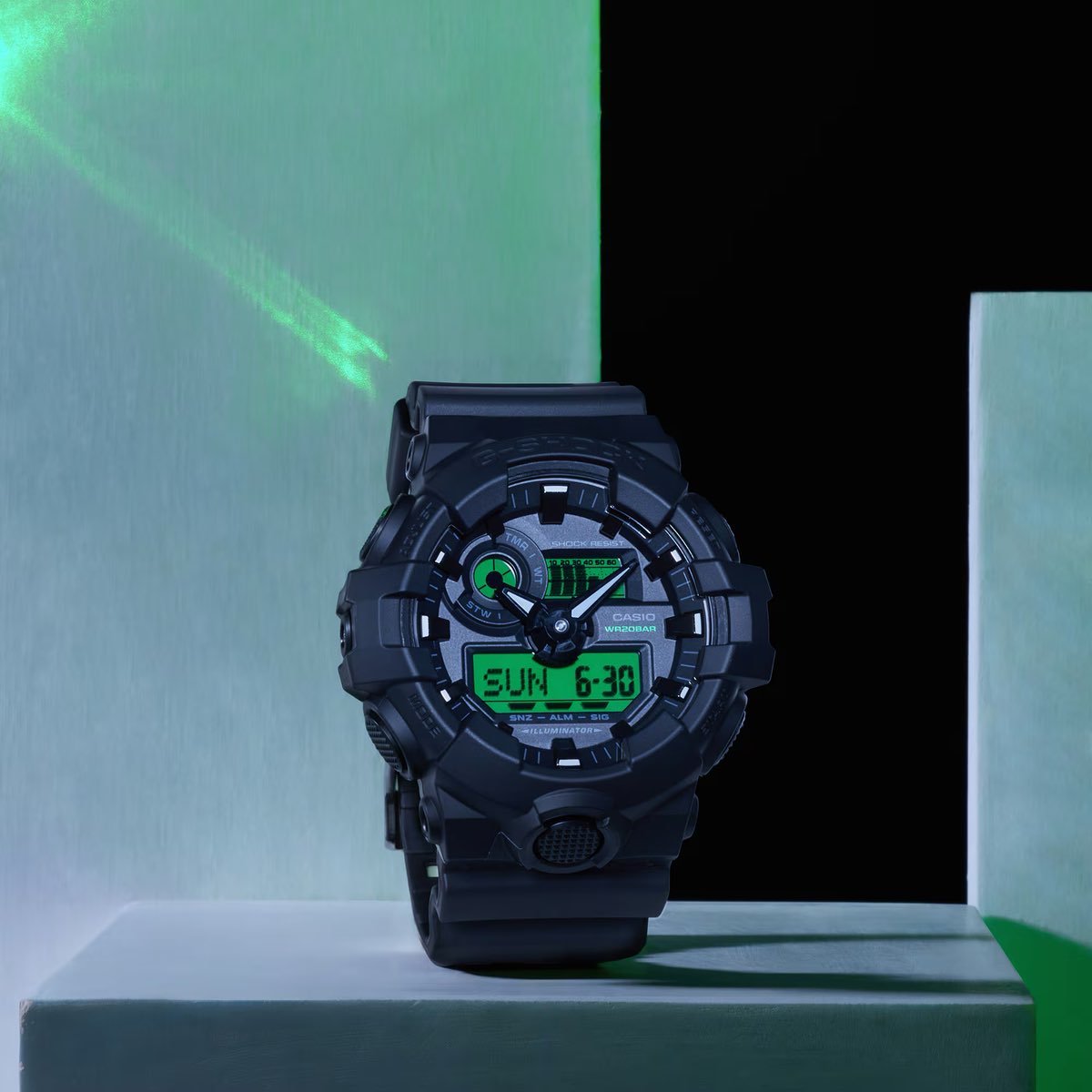 GA-700BEG-1A har en betydligt djärvare silhuett med aggressiva stötfångare i harts och en framträdande texturerad frontljusknapp. Istället för tvådelade skärmar använder den en enda, ren elektrogrön LCD-skärm i kombination med stora 3D-visare och en cirkulär subdial. Den saknar antimagnetisk avskärmning men har ett batteri som håller i fem år. Priset är 18 700 ¥, samma som för GA-100BEG.