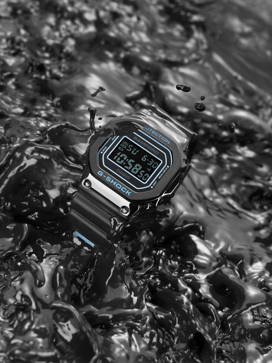 Medan det ursprungliga tillkännagivandet fokuserade på grunderna - en polerad svart finish, negativ LCD och Bamfords varumärke ljusblå accenter - ger dessa nya bilder oss en något bättre känsla av klockans personlighet. En dramatisk produktbild placerar GM-5600 i tjock svart vätska. En annan bild fångar klockan som till synes smälter eller droppar och visar upp glansen från dess glansiga utsida. Båda bilderna visar den estetiska kontrasten mellan det matta Bamford-märket på armbandet och det polerade metallfodralet.