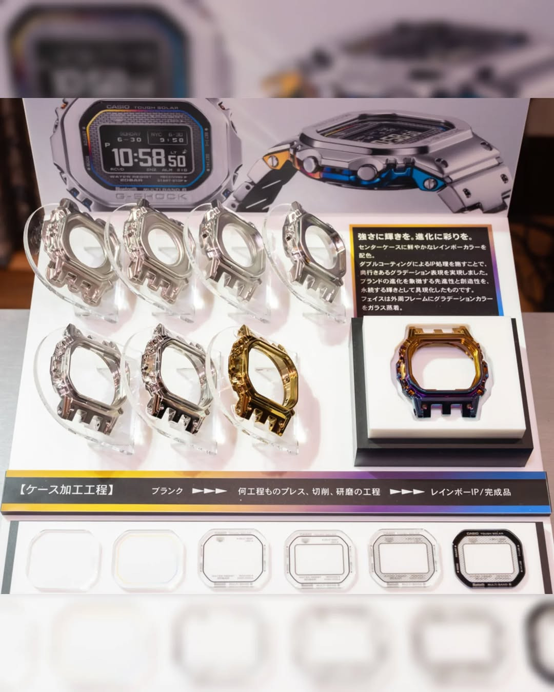 En av de tydligare bilderna visar också den skiktade konstruktionen av boetten. Flera oavslutade metallskal visas tillsammans med en färdig regnbågsbehandlad enhet för att visa bearbetnings- och efterbehandlingsprocessen i flera steg. Sidoprofilen visar en annan detalj som inte var lika uppenbar tidigare. Ramen, boetten och den inre strukturen ser mer segmenterad ut än på äldre GMW-B5000-modeller. Det finns mycket tydliga övergångar mellan polerade stålytor och den färgade innerramen. Skruvarna och tryckknapparna har också en något annorlunda ton.