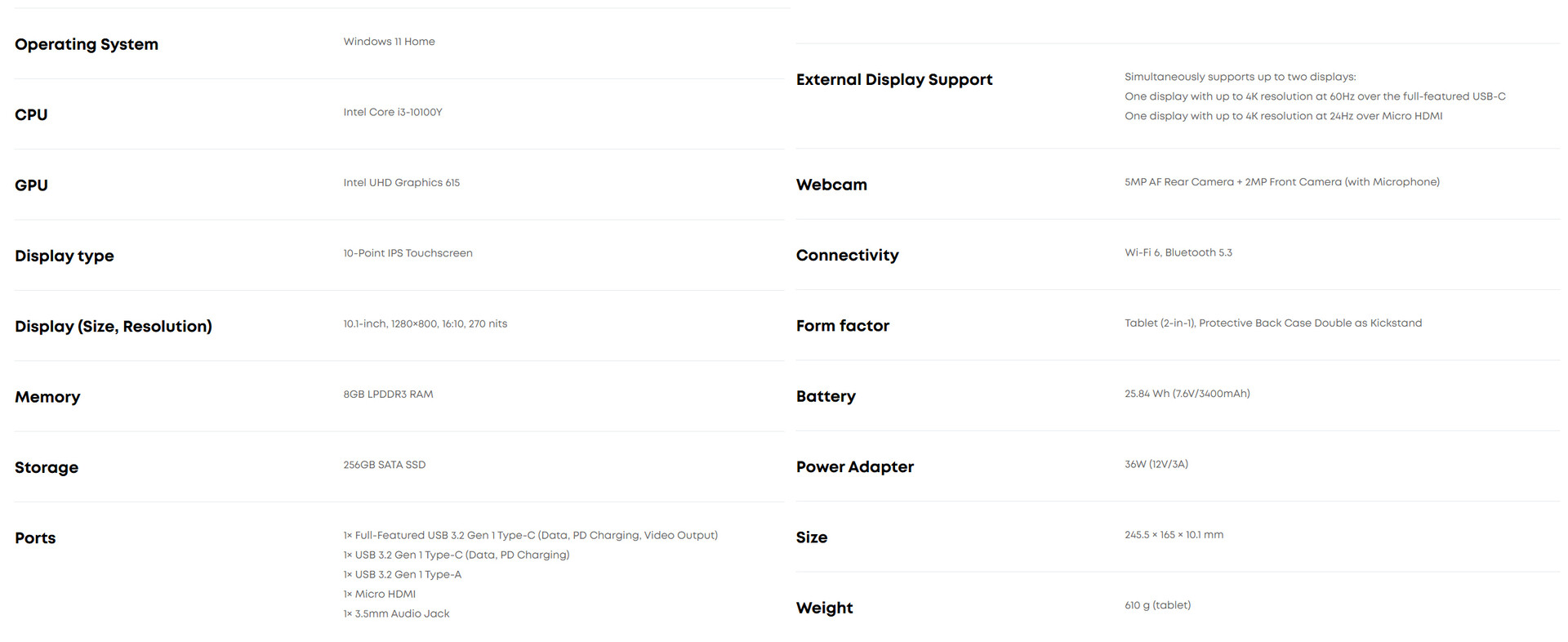 Men medan föregångaren drevs av Intel N150har den nyare Hi10 X2 Intel Core i3 10100Y. Det är en dubbelkärnig processor från Amber Lake-serien. Medan denna CPU inte kan anses vara en riktig uppgradering jämfört med föregångaren, har den en något lägre TDP än N150, vilket kan leda till en bättre batteritid.