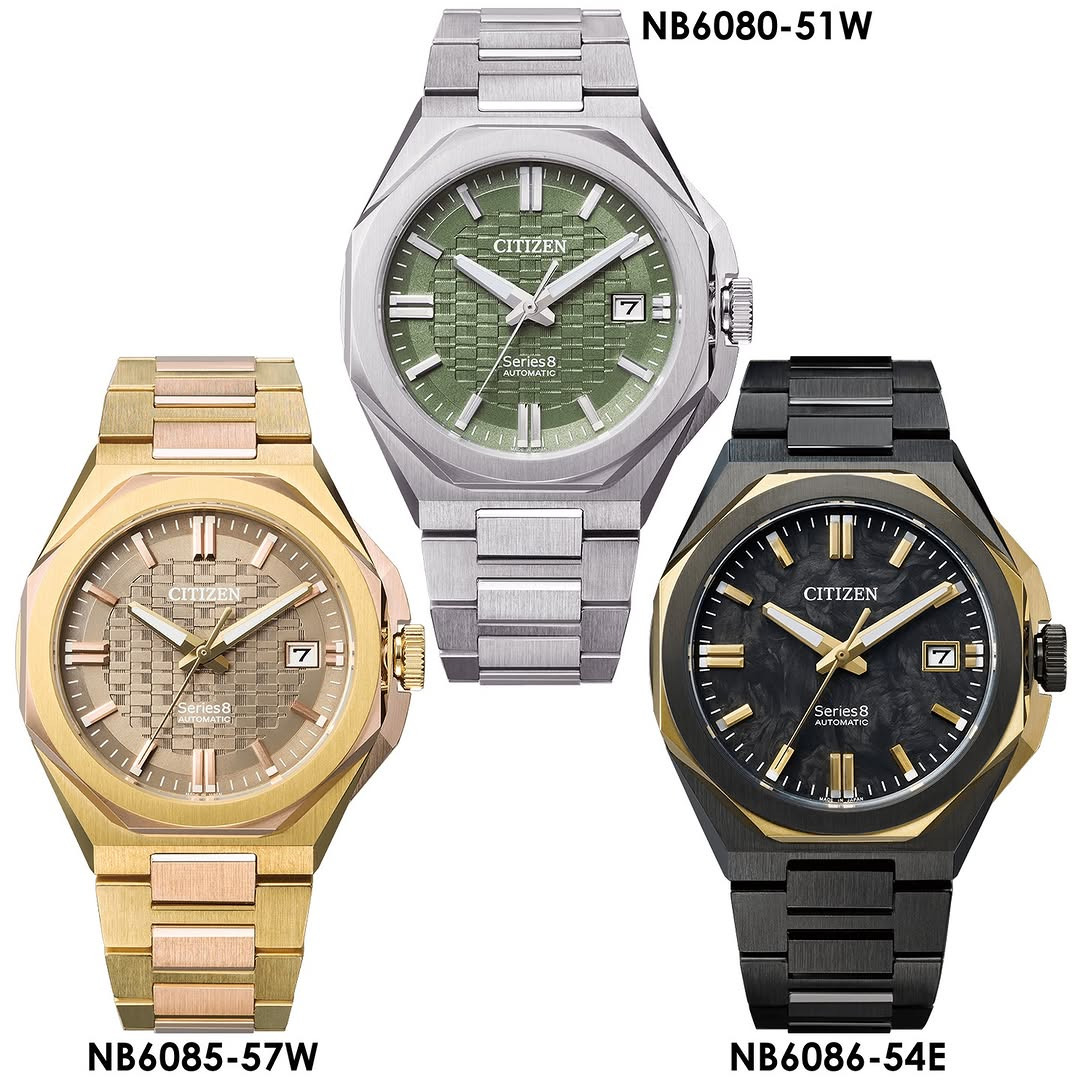 Citizen är på hugget just nu och utökar Series 8-sortimentet med lanseringen av NB6080-51W, NB6085-57W och en referens i begränsad upplaga, NB6086-54E. Dessa modeller är mindre i storlek jämfört med tidigare 42 mm-varianter, tack vare en övergång till en diameter på 39,3 mm för att möta aktuella marknadstrender. Boetten är uppbyggd av fem olika komponenter i rostfritt stål, som alla är polerade för att uppnå en flerkantig finish. En viktig teknisk specifikation är tjockleken på 10,4 mm - detta uppnås samtidigt som ett 20-bar (200 meter) vattenmotstånd bibehålls.