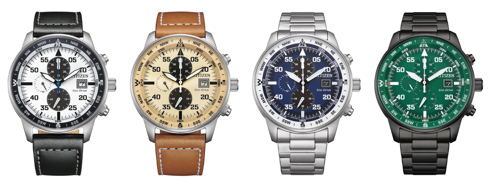 Alla dessa Citizen-klockor har en dekorativ kompassring och en enkel datumindikator. Det finns tre urtavlor, varav en visar tiden i 24 timmars format och den andra är kopplad till kronograffunktionen. Dessa klockor använder Eco-Drive B612-kalibern, vilket gör att de kan drivas med ljus. Det finns också funktioner som en varning för otillräcklig laddning och en funktion för att förhindra överladdning.