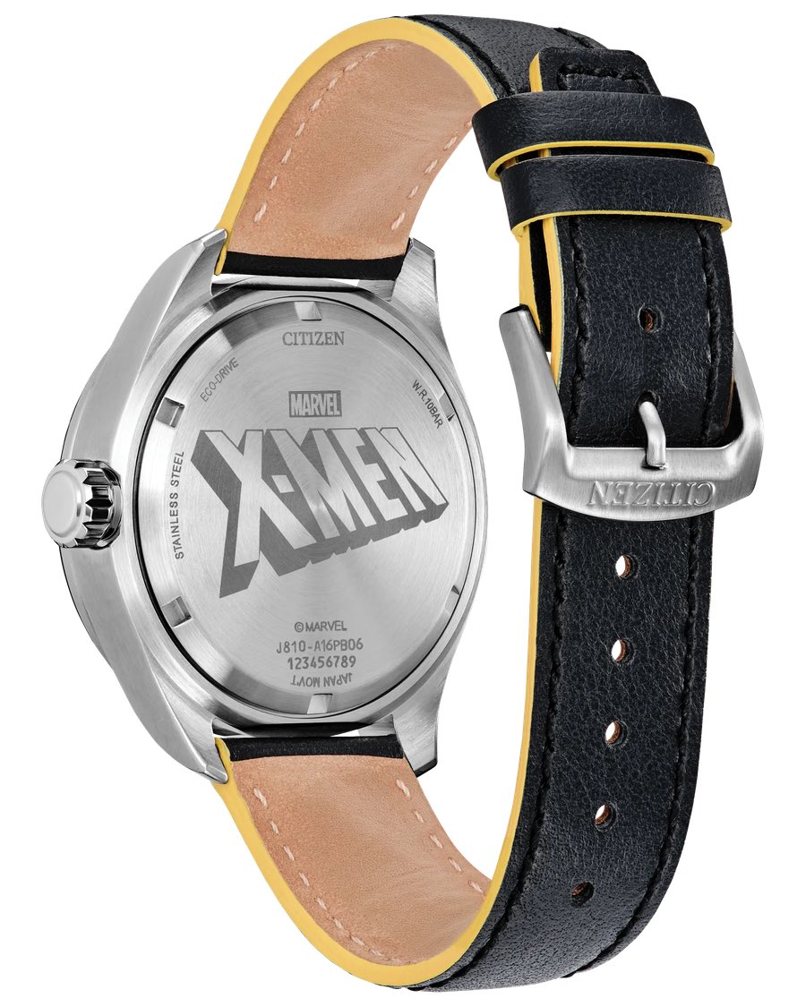 På den svarta urtavlan med dubbla lager är ett stort silverfärgat "X" tydligt centrerat i en silverfärgad ring. Det finns också en subtil referens till X-Mens ursprungliga Blue Team och Gold Team, vilket framgår av de blå accentuerade indexen klockan 12 och klockan 6 och de guldaccentuerade indexen klockan 3 och klockan 9. Det texturerade svarta läderarmbandet med gula kantdetaljer och en X-Men-logotyp etsad på boettbaksidan i rostfritt stål fulländar den övergripande estetiken. Klockan levereras i ett speciellt Citizen x Marvel-tema paket.
