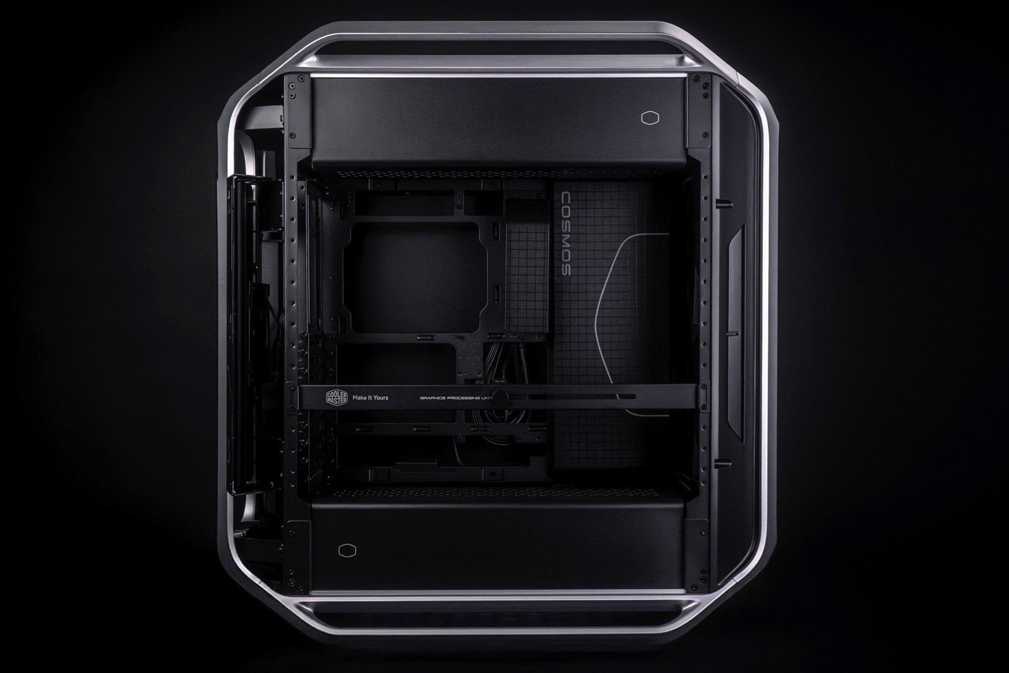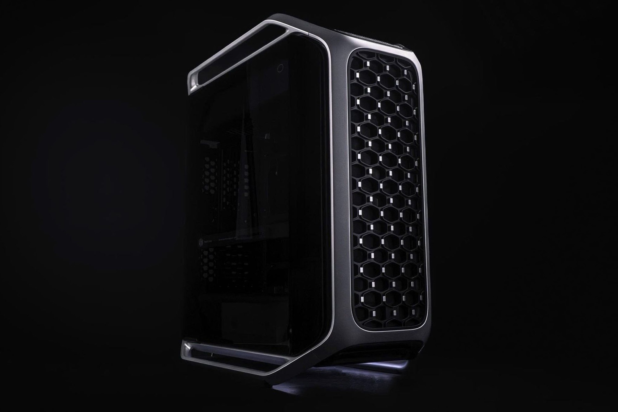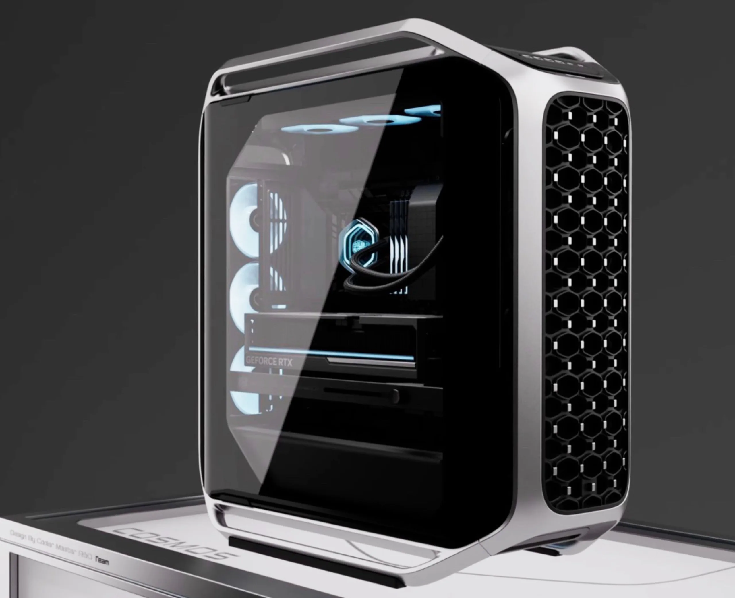 Cooler Master Cosmos Alpha är ett nytt flaggskeppstorn för PC som kombinerar en aluminiumram med en sidopanel i glas. Ramen övergår sömlöst i fötter och handtag, vilket förenklar transporten. Frontpanelen är perforerad för att maximera luftflödet till fläktarna bakom den.