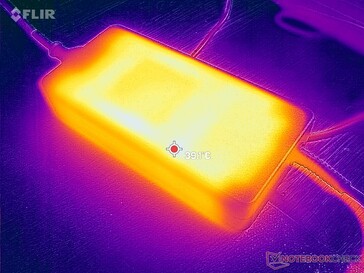 Att köra Prime95 och FurMark samtidigt skulle få förbrukningen att växla kraftigt från så lågt som 167 W upp till 298 W trots att den stora (~18 x 8,4 x 3,5 cm) nätadaptern är dimensionerad för 280 W. Förbrukningen skulle vara mycket stabilare när man upprepade det här testet på den RTX 4090-utrustade Neo 16, vilket framgår av jämförelsediagrammet nedan.