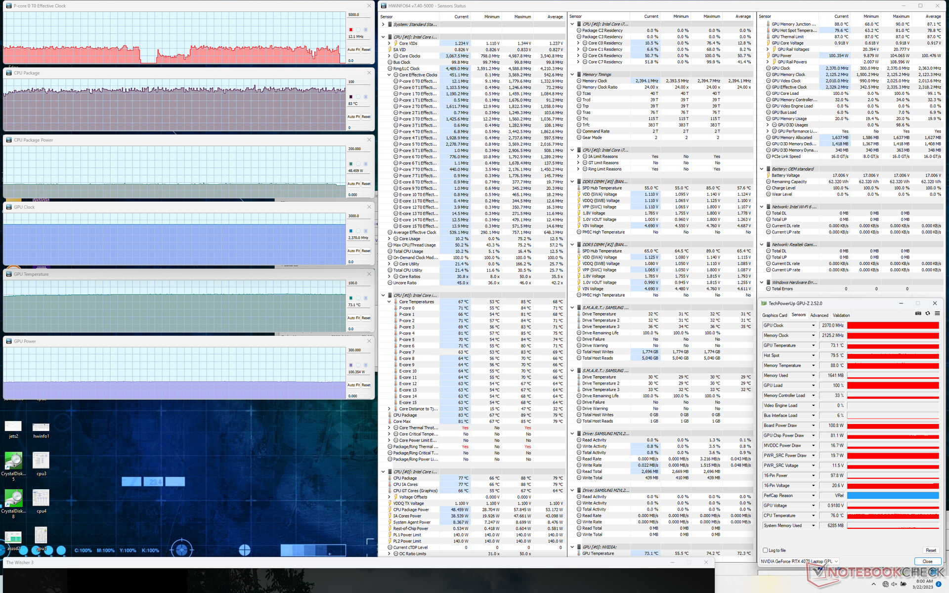 CPU- och GPU-temperaturen när Witcher 3 körs skulle stabiliseras på 83 C respektive 73 C, jämfört med 78 C vardera på Blade 16. GPU-kortets strömförbrukning skulle stabiliseras på endast 100 W jämfört med dess 140 W TGP-klassning.