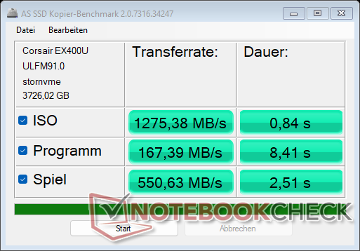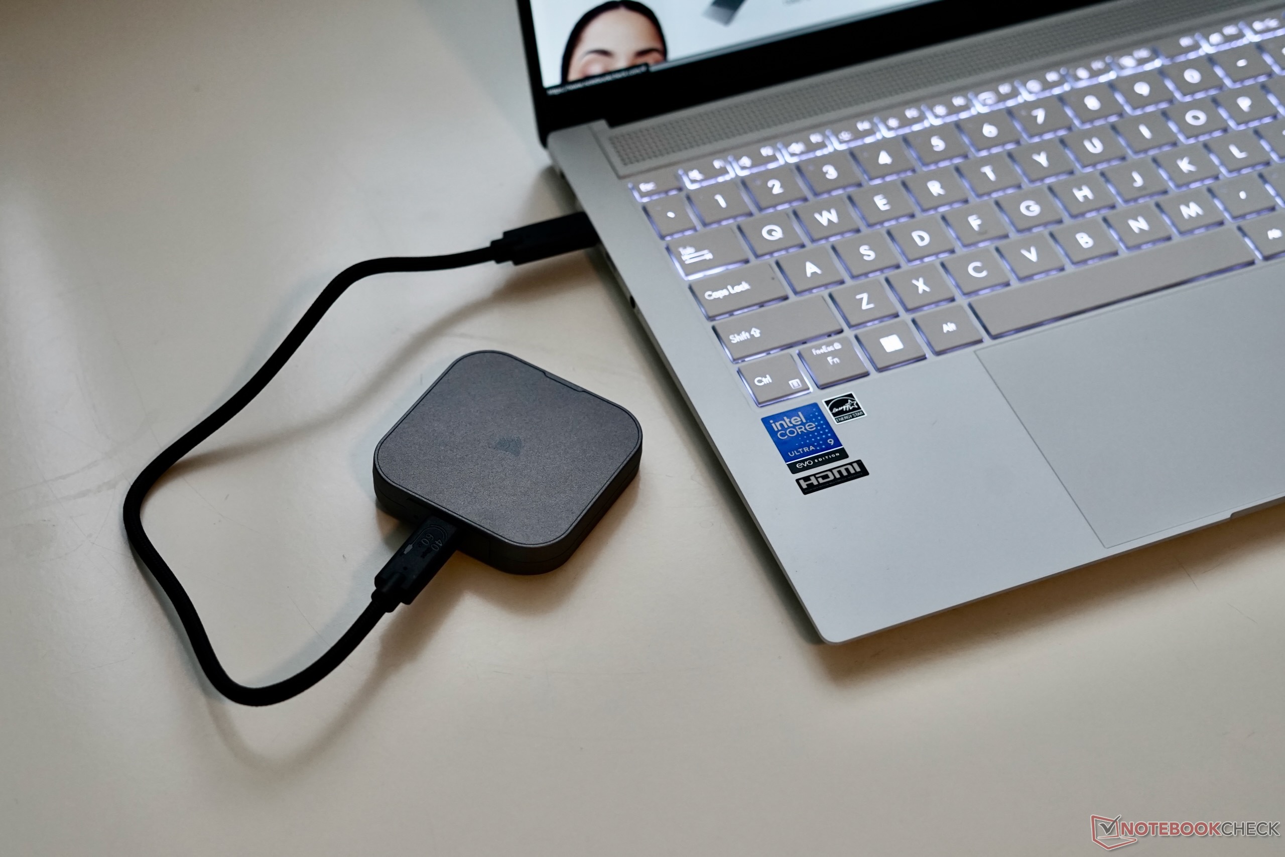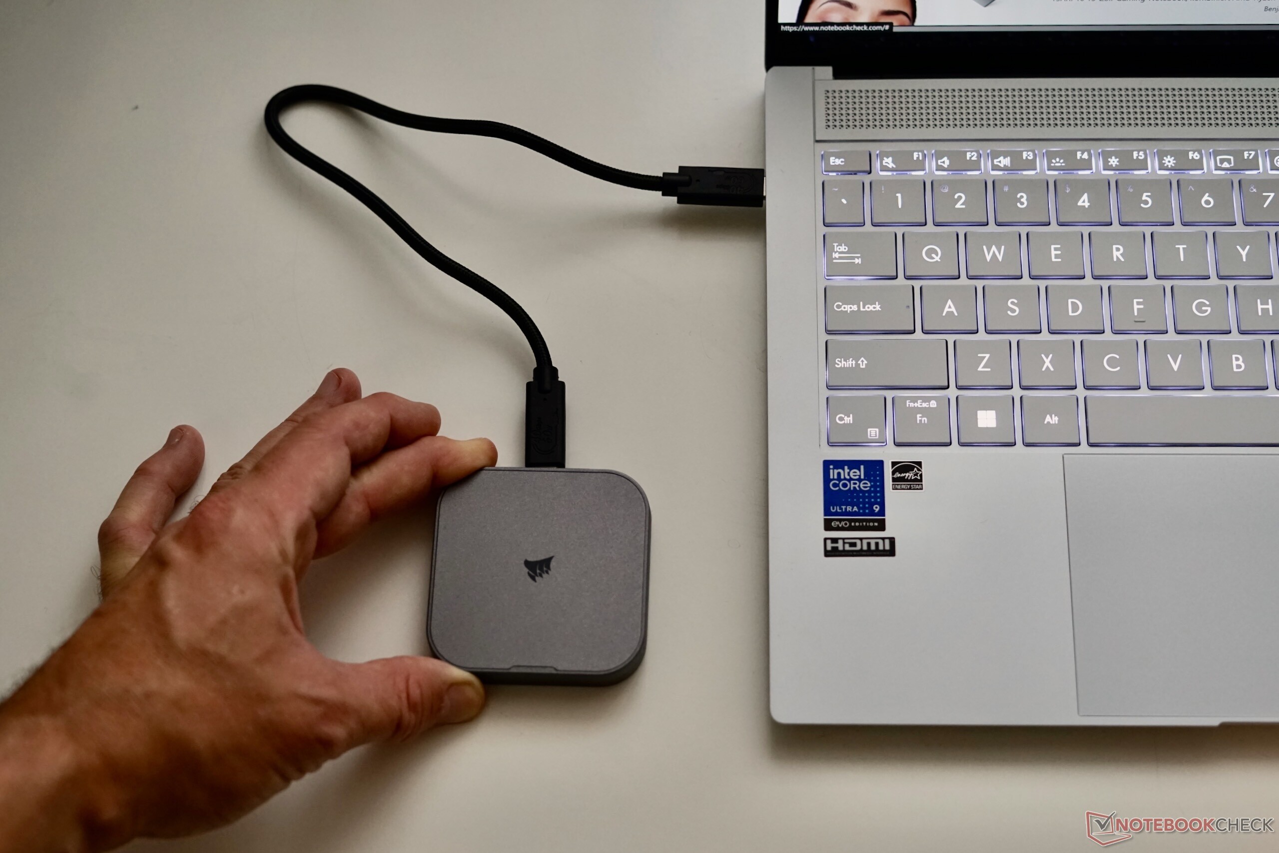 Vi mätte prestandan hos det externa lagringsmediet på olika enheter. Med Asus Zenbook OLED med den snabba Intel Core Ultra 9 288V uppnådde vi utmärkta prestandavärden som till och med precis överträffar specifikationerna för sekventiell läsning (diskspd-test). Corsair presterar exceptionellt i de syntetiska läs- och skrivtesterna och gör sig inte heller besviken i de andra syntetiska testerna. I AS SSD Copy-riktmärket faller prestandan dock tydligt bakom snabba integrerade SSD-enheter.
