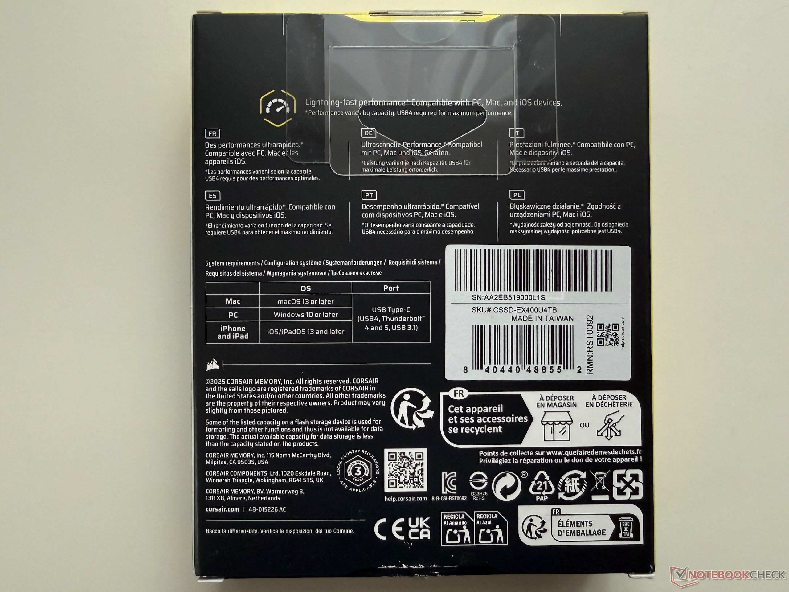 Corsair EX400U 4TB (CSSD-EX400U4TB) drivs av Phison PS2251-styrenheten, som erbjuder inbyggt USB-stöd. Enligt Corsair är de använda TLC NAND-minneskretsarna från Kioxia. SSD-enheten har 3 års garanti så länge TBW (Tobal Bytes Written) på 1.000 terabyte (för 4TB-modellen) inte överskrids. Som en specialfunktion har SSD-enheten en MagSafe-ring på baksidan. Detta gör att SSD-enheten kan anslutas till alla nuvarande iPhones och till exempel skriva ProRes direkt till SSD-enheten på iPhone 16 Pro i testet.