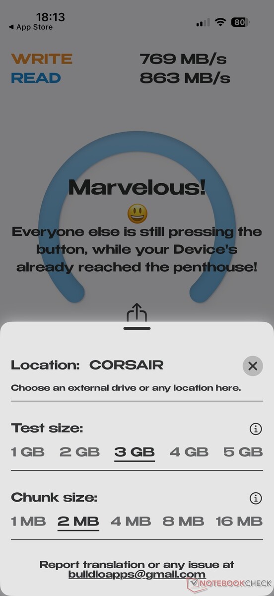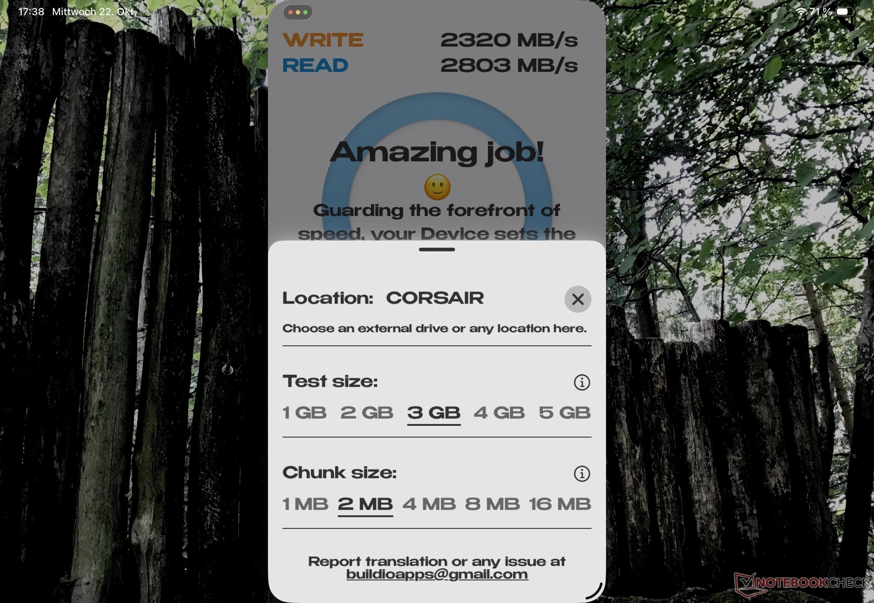 Använder en iPad Pro (M4 från 2024 med 256 GB bas SSD) corsair SSD:s prestanda är imponerande. Mer än dubbelt så snabb läsprestanda och 66% snabbare skrivprestanda talar för sig själva. Den kommer dock inte i närheten av de maximala 4 000 MB/s. IPhone 16 Pro är en annan historia, eftersom USB-porten tillåter betydligt mindre prestanda. EX400U uppnår endast 860 / 770 MB/s (läs / skriv). Men åtminstone vid skrivning är den till och med något snabbare än den interna 128 GB SSD-enheten.