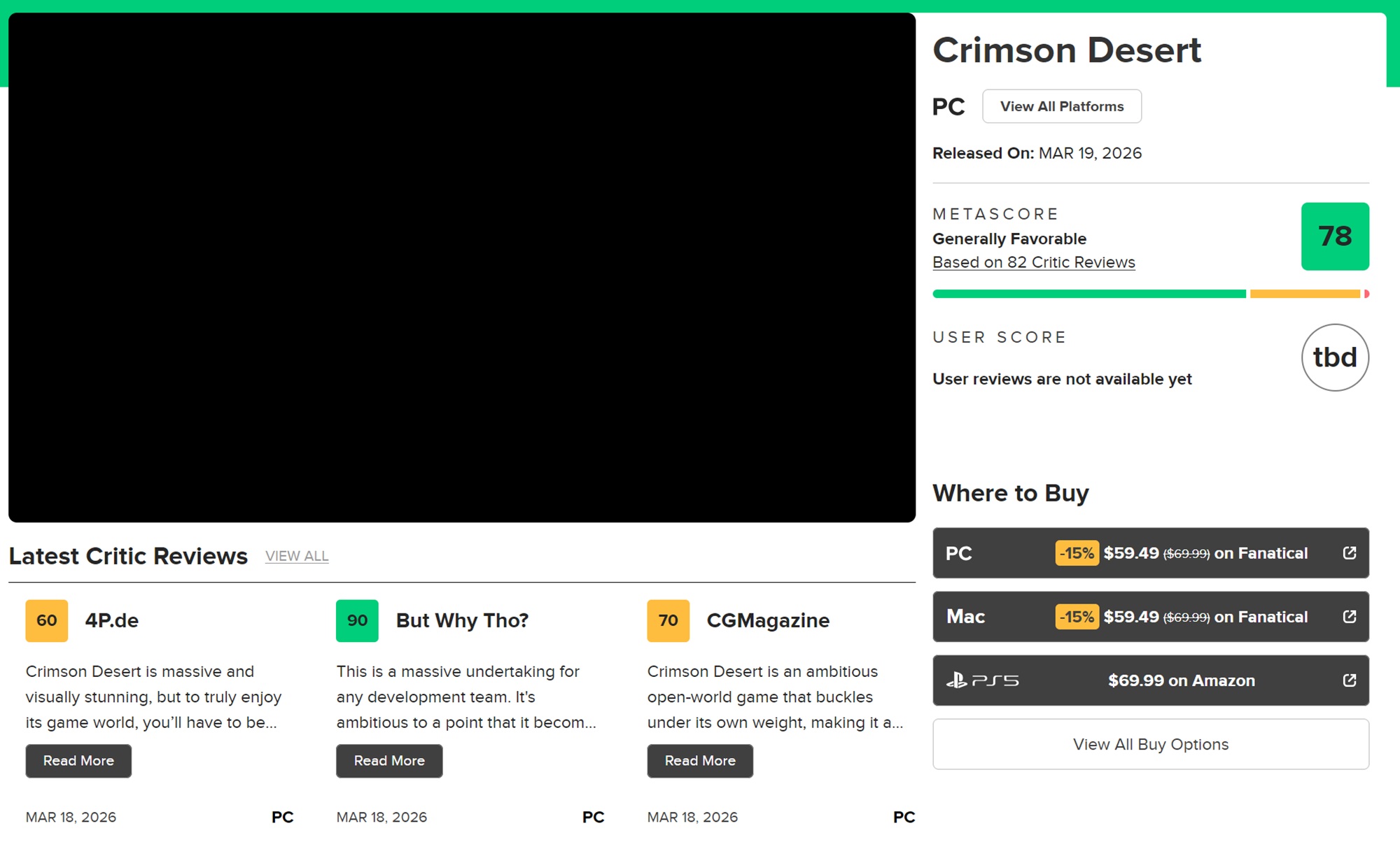 Även om det inte alltid avgör försäljningen kan kritiken ändå påverka köpbesluten. Crimson Desert Crimson Desert granskningsembargo löpte äntligen ut och släppte dussintals utvärderingar på Metacritic. Efter 82 inlämningar har spelet i den öppna världen en Metascore på 78. De flesta webbplatser berömmer sin ambitiösa grafik och fysik, men noterar irritationer som kan frustrera många spelare.