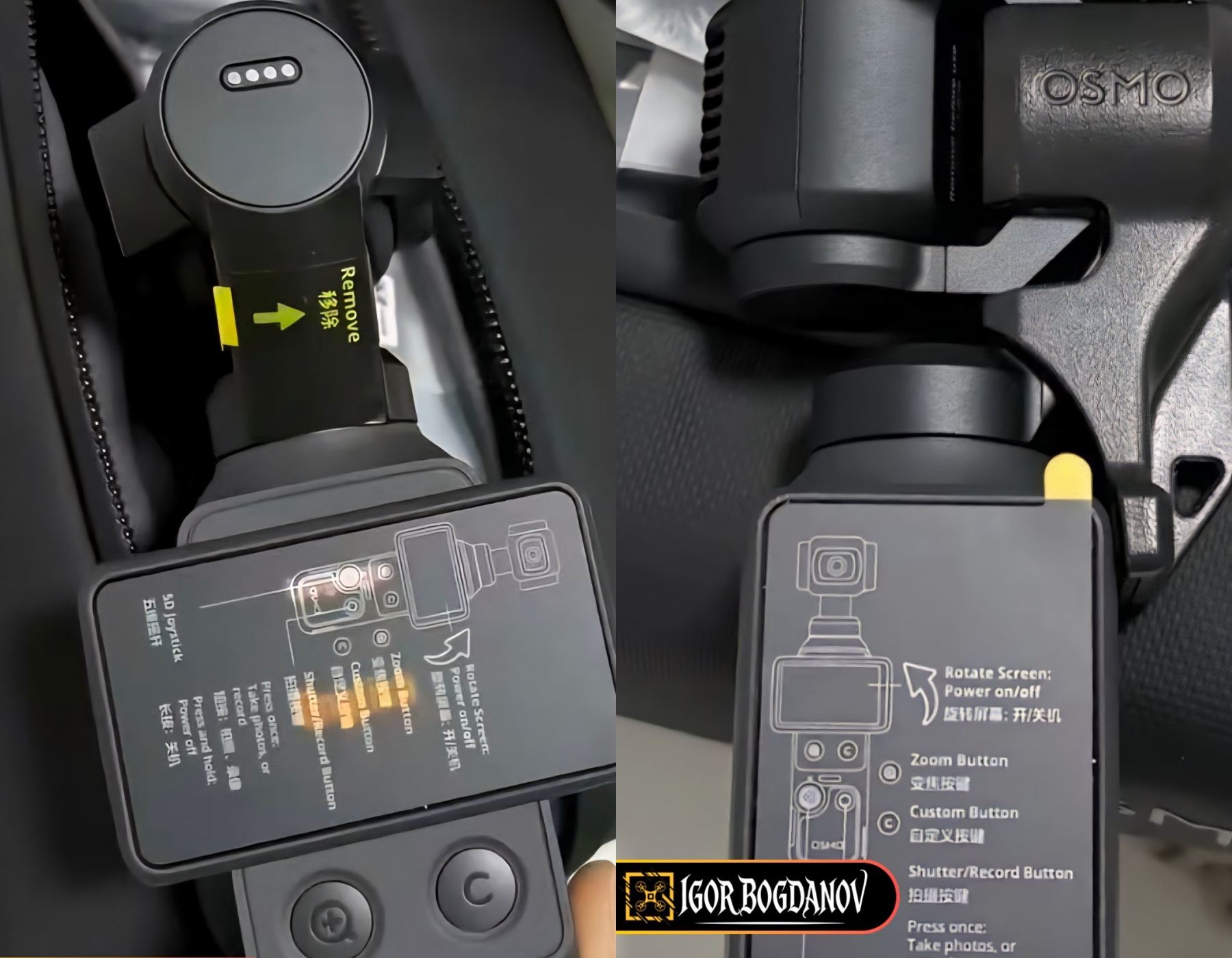 De senaste DJI Osmo Pocket 4 bildläckorna (uppskalade med Gemini), visar texten på de skyddande guideklistermärkena på vlogging-kamerans gimbal, vilket bekräftar funktionaliteten bakom de nya knapparna.