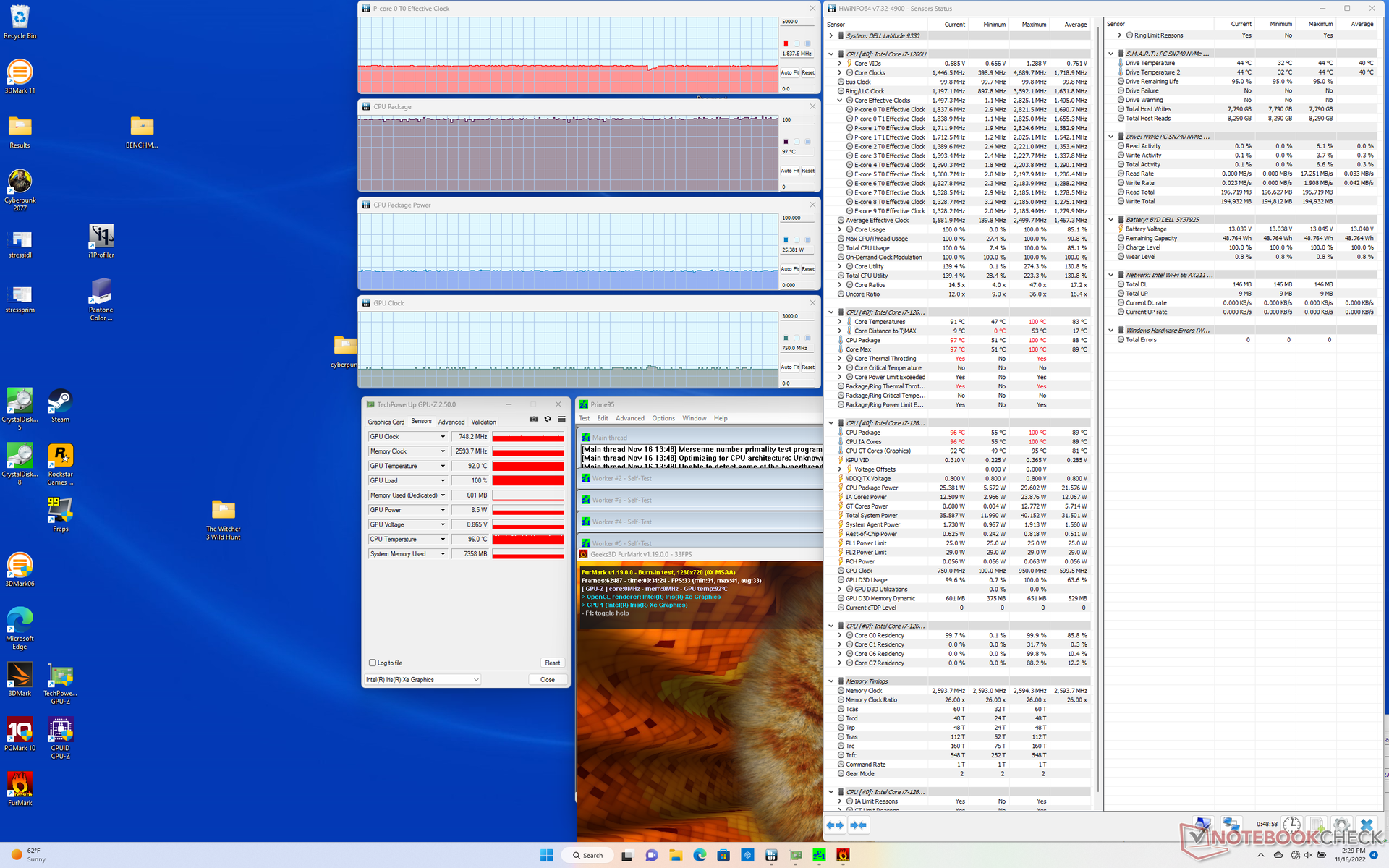 GPU-klockfrekvens och temperatur vid drift Witcher 3 för att representera krävande grafikbelastning skulle stabiliseras på 948 MHz respektive 91 C, jämfört med bara 700 MHz och 61 C på den tidigare nämnda HP.